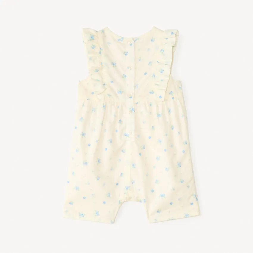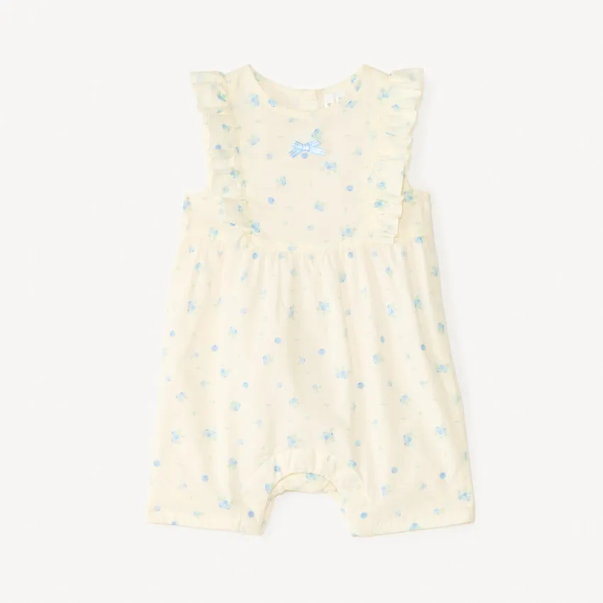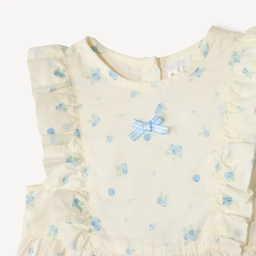 Модель украшена милым принтом с ягодами по всей поверхности. Спереди расположен аккуратный атласный бантик в полоску, а по плечам — нежные рюши, которые придают образу особое очарование. Сзади предусмотрена застёжка на пуговицы, а кнопки внизу облегчают переодевание и смену подгузника. Лёгкая хлопковая подкладка делает ромпер ещё более комфортным для малыша.