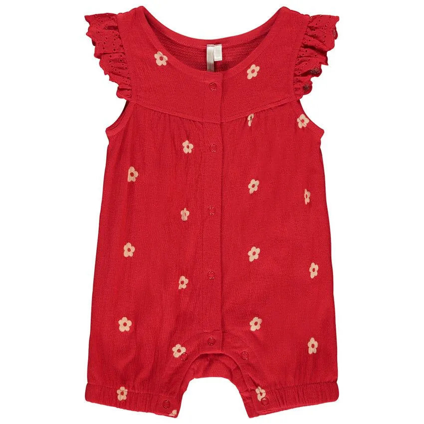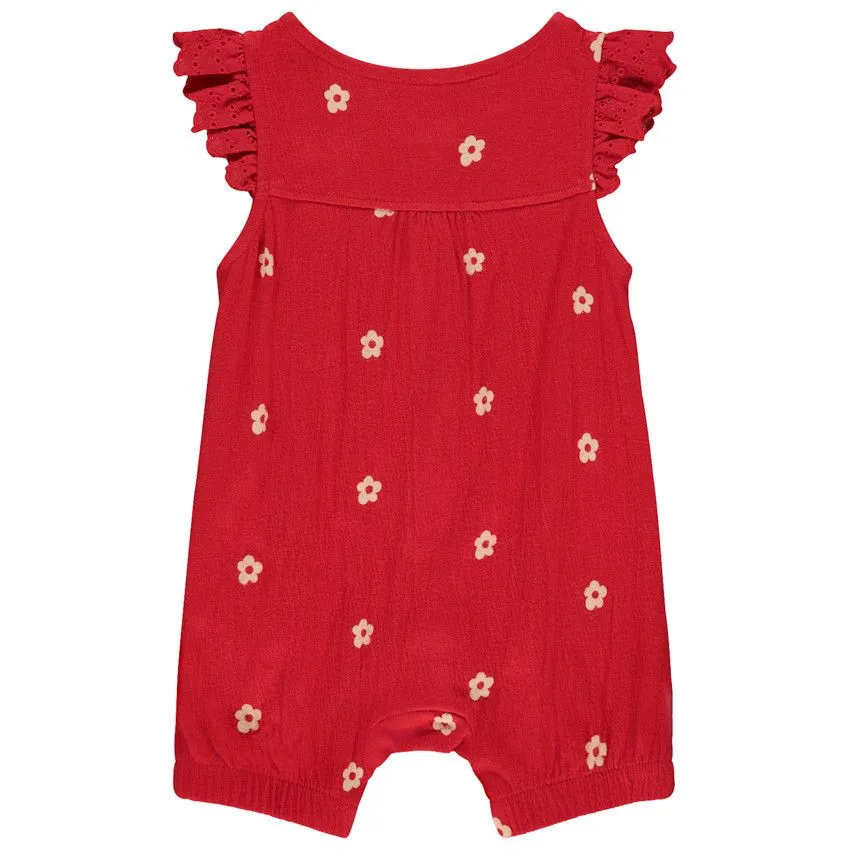 Проймы рукавов оформлены воланами с изысканной вышивкой, придавая модели женственности и утончённости. комбенизон застёгивается на кнопки спереди и на ножках обеспечивая удобство при надевании.