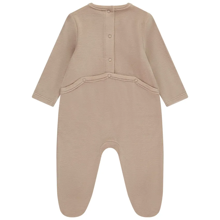 Бархатный комбинезон для малыша с милым котиком по центру — уютный и очаровательный вариант для повседневной носки и сна. Нежный бархатистый материал приятен на ощупь и создаёт ощущение тепла и комфорта.