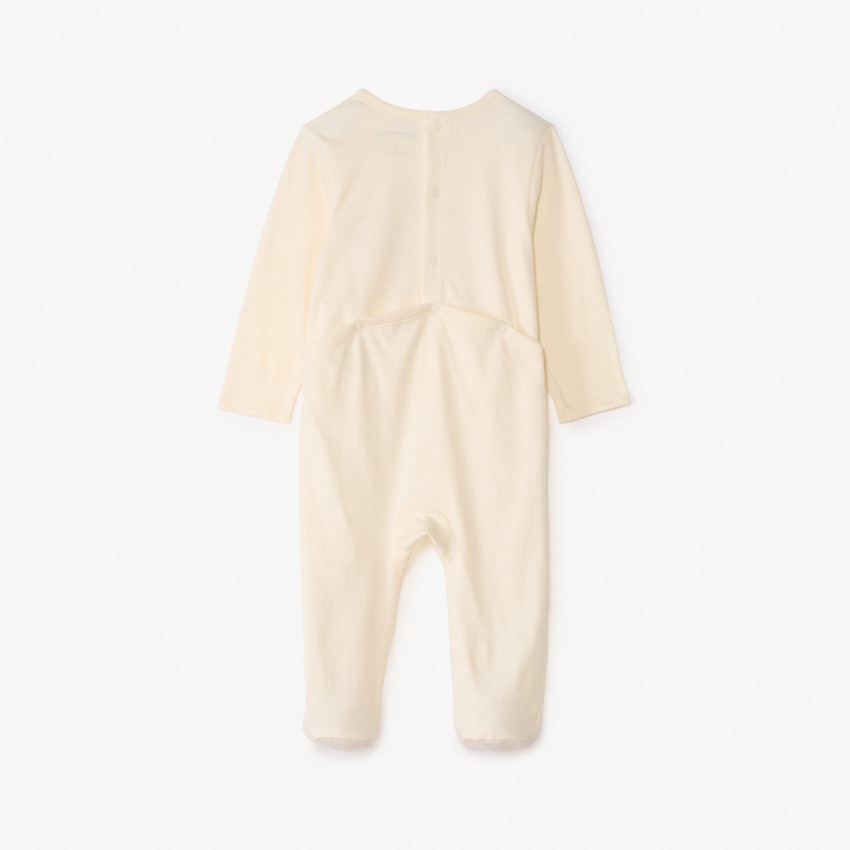 Слип имеет длинные рукава и закрытые ножки, что помогает сохранять тепло. Застёжки на кнопках на спинке и внизу облегчают переодевание и смену подгузника. Спереди модель украшена милым декоративным принтом.
