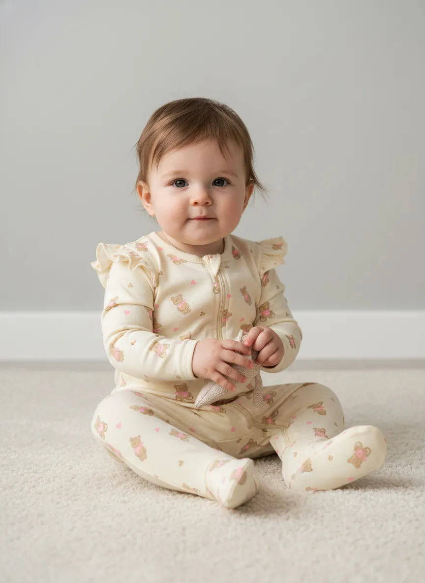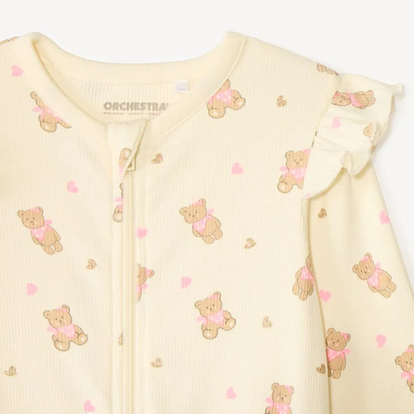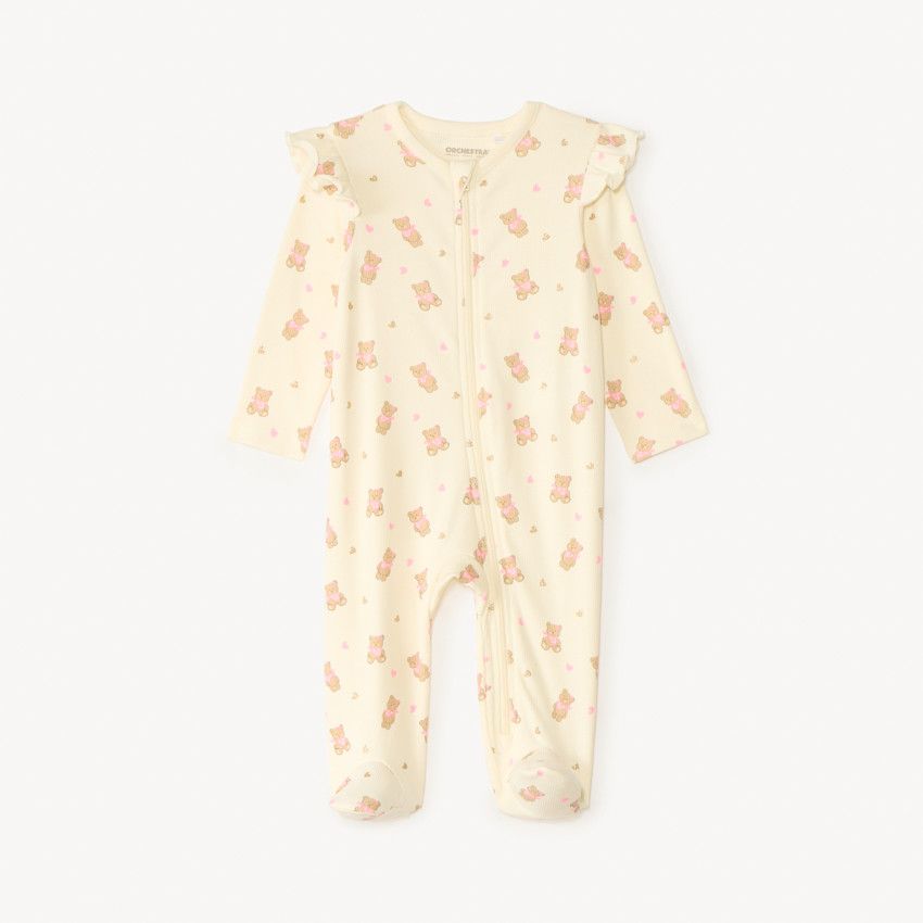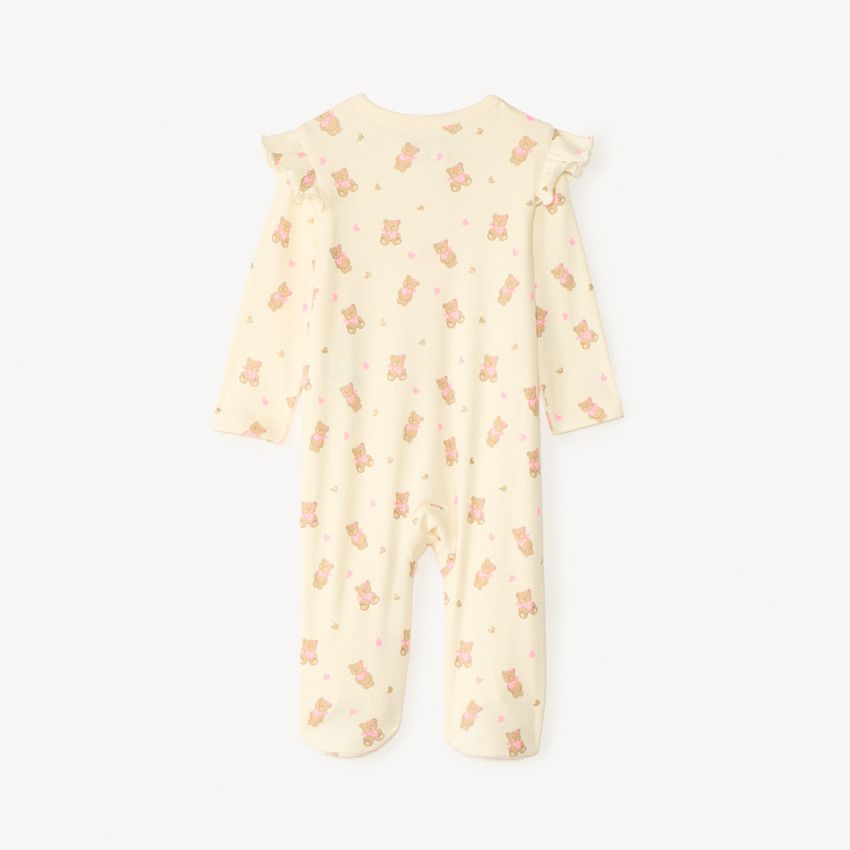 Комбинезон для малышки — мягкая и уютная модель для повседневного ношения и сна. Изделие украшено принтом с изображением плюшевых мишек и сердечек по всей поверхности, что придаёт ему милый и нежный вид. Комбинезон застёгивается на молнию по всей длине спереди и дополнен защитой подбородка для большего комфорта малыша. Ткань с составом 95% хлопок и 5% эластан приятна к телу, хорошо тянется и обеспечивает удобство в течение всего дня.