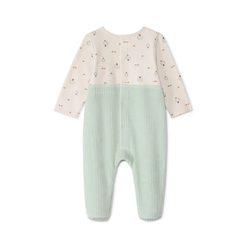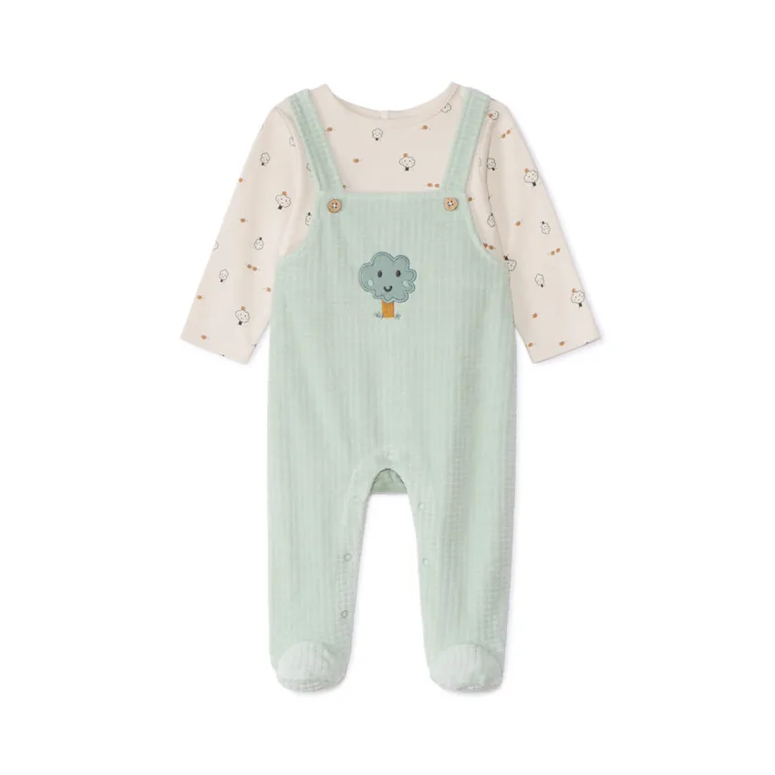 Комбинезон с эффектом 2-в-1 — выглядит как комплект из футболки и велюрового комбинезона. Верх выполнен из мягкого трикотажа цвета экрю с принтом ёжиков и деревьев по всей поверхности. Круглый вырез и застёжка на кнопки на спинке. Нижняя часть имитирует зелёную велюровую "салопетку" с декоративными кокосовыми пуговицами на бретелях и нашивкой в виде дерева спереди. Удобная застёжка на кнопки между ножек. Ножки закрытые.