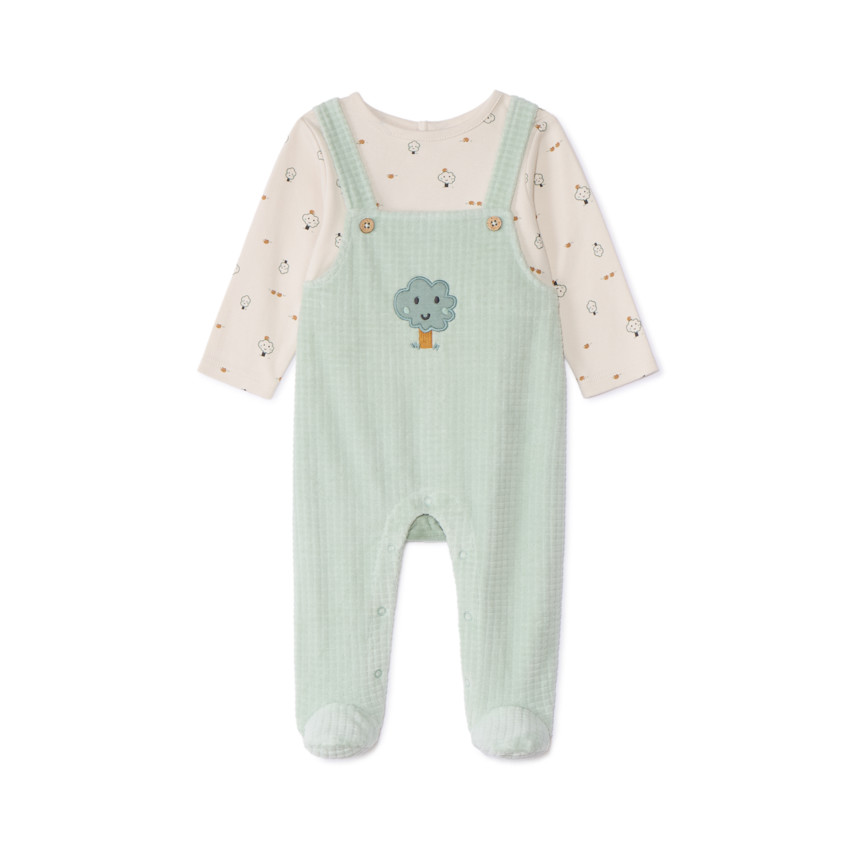 Комбинезон с эффектом 2-в-1 — выглядит как комплект из футболки и велюрового комбинезона. Верх выполнен из мягкого трикотажа цвета экрю с принтом ёжиков и деревьев по всей поверхности. Круглый вырез и застёжка на кнопки на спинке. Нижняя часть имитирует зелёную велюровую "салопетку" с декоративными кокосовыми пуговицами на бретелях и нашивкой в виде дерева спереди. Удобная застёжка на кнопки между ножек. Ножки закрытые.