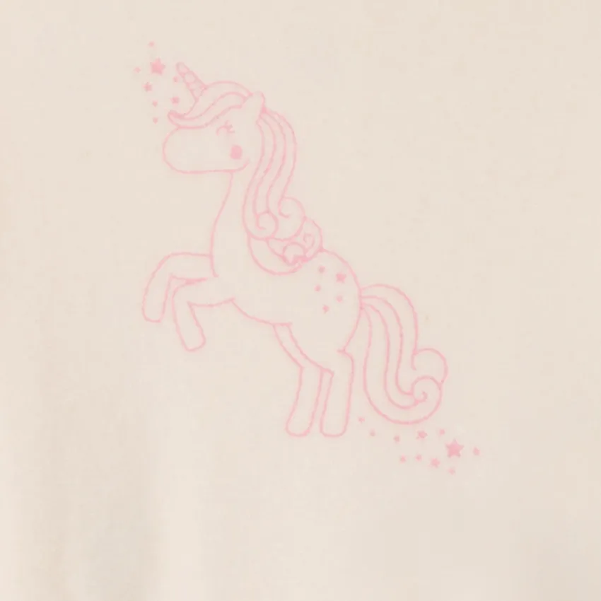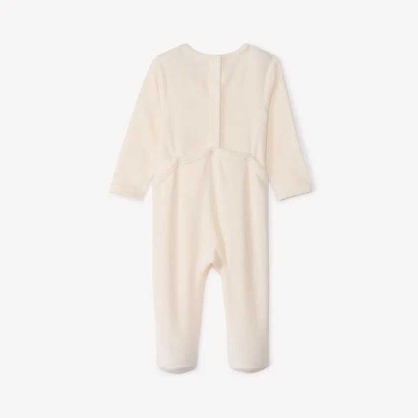 Велюровый комбинезон из мягкой ткани однотонного цвета. Спереди украшен контрастным розовым принтом. Круглый вырез горловины, застёжка на кнопки по спинке и внизу для удобства переодевания. Закрытые ножки, задняя часть однотонная.