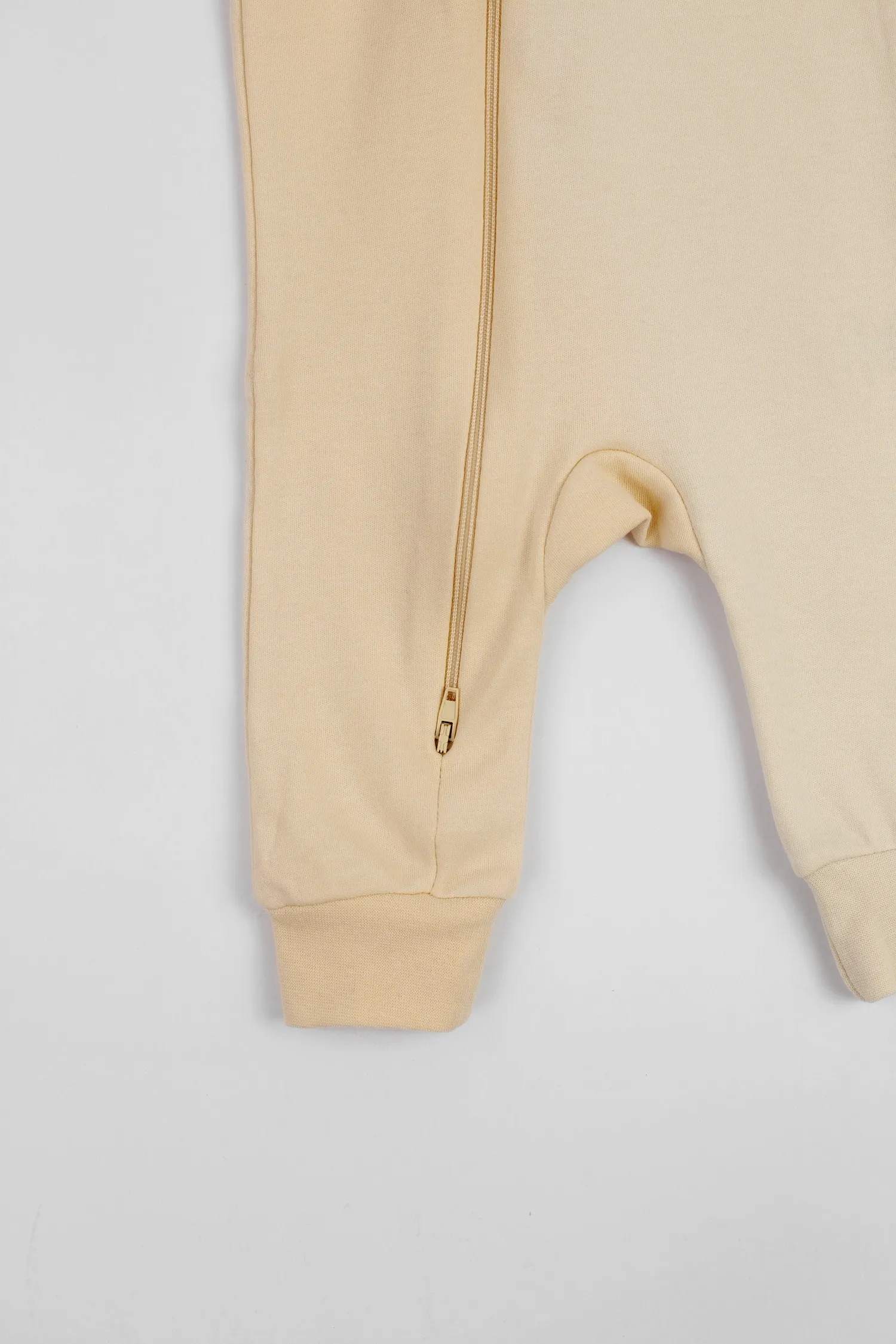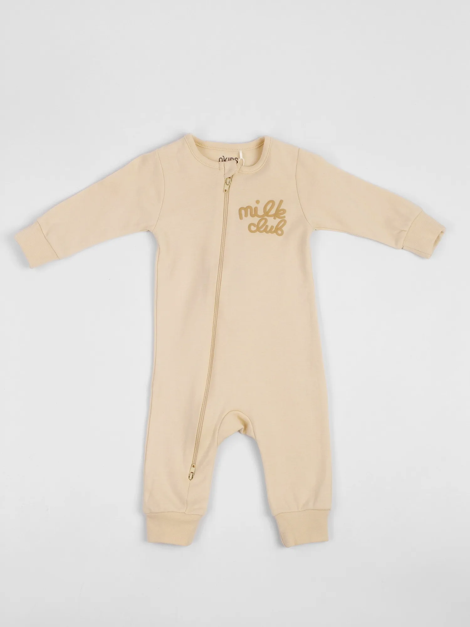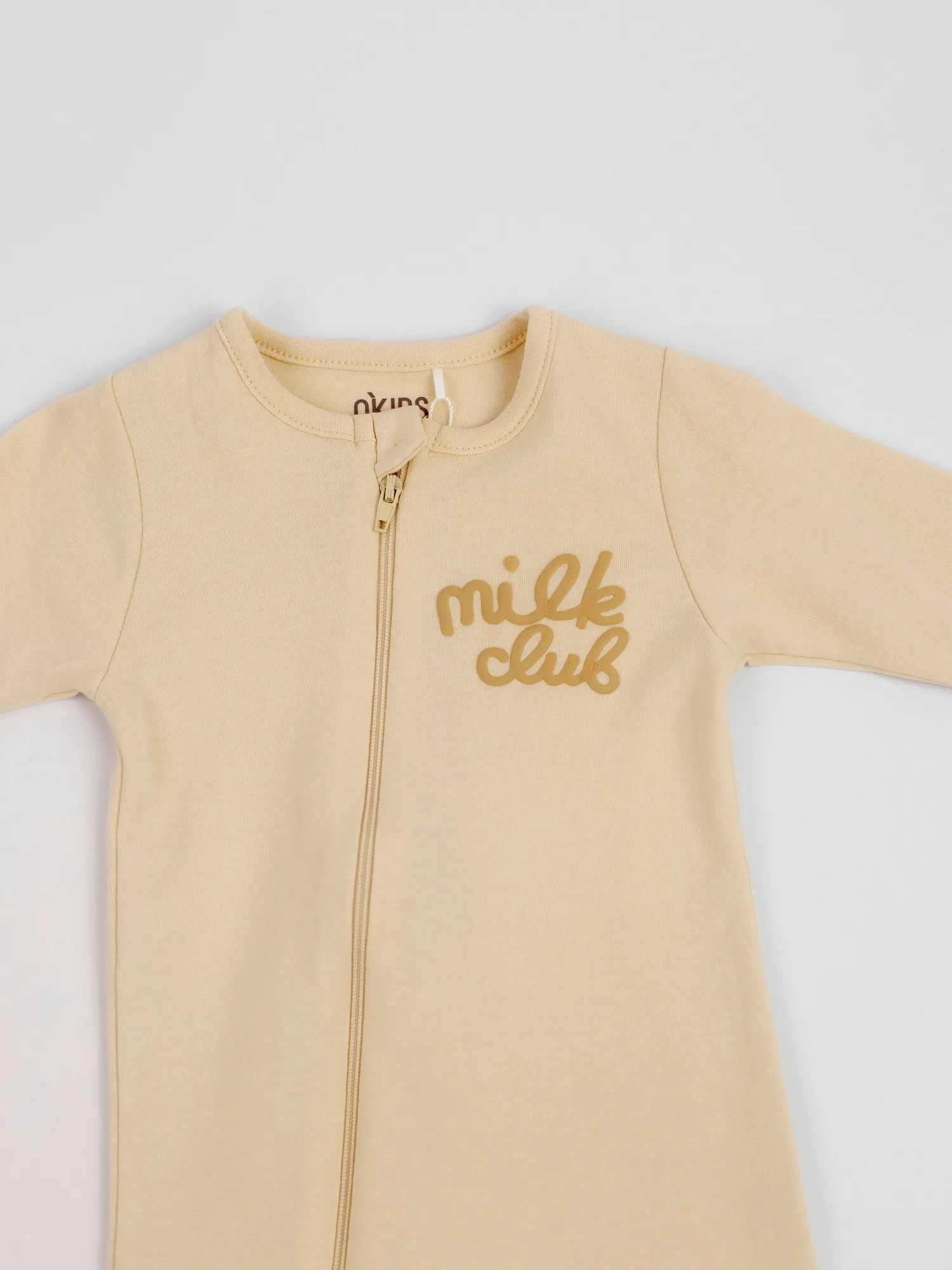 Мягкий бежевый цвет, лаконичный дизайн и надпись "milk club" придают изделию современный и милый вид. Комбинезон выполнен из приятного на ощупь хлопкового материала, который бережно заботится о чувствительной коже ребёнка.
