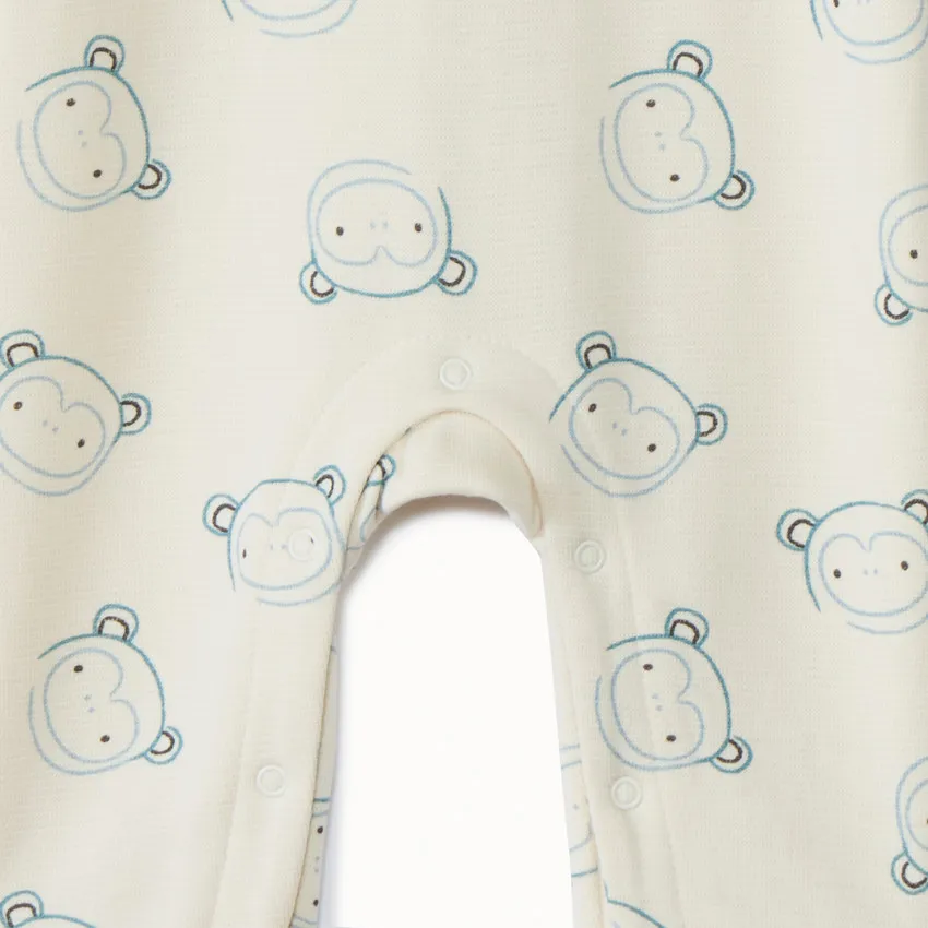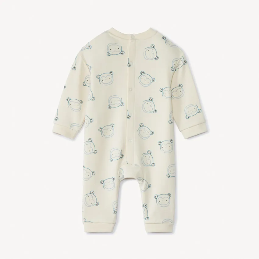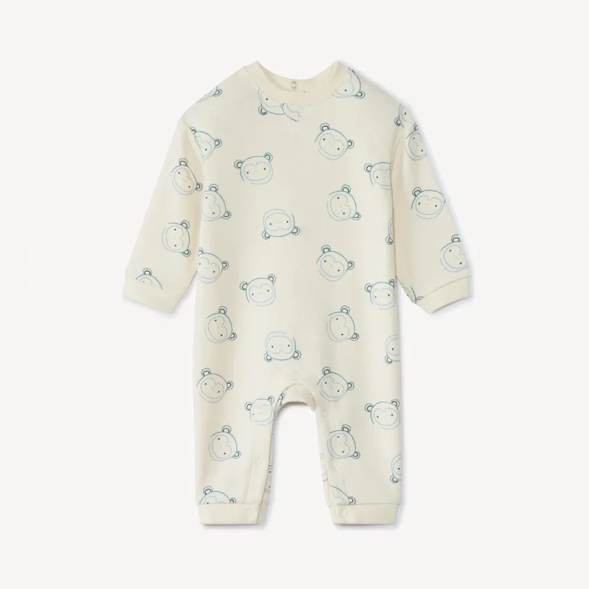 Длинный детский комбинезон из хлопкового трикотажа цвета экрю с забавным принтом обезьян. Круглый вырез в рубчик, застёжки‑кнопки на спинке и по шаговому шву упрощают переодевание. Длинные рукава, мягкие манжеты и щиколотки с эластичной резинкой обеспечивают удобную посадку и сохраняют тепло.