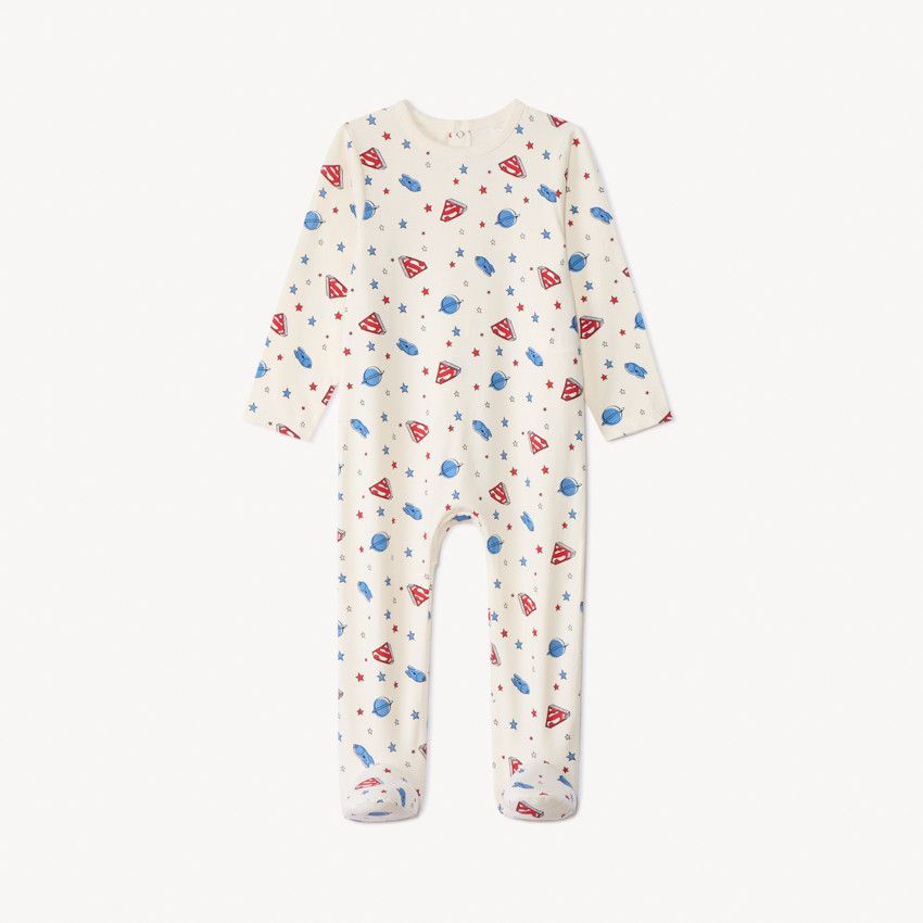 Уютный комбинезон для сна из мягкого хлопкового трикотажа с ярким принтом Superman. Закрытые ножки и длинные рукава обеспечивают тепло и комфорт. Застёжка меняется в зависимости от размера: кимоно-воротник для самых маленьких и классический вырез с кнопками на спинке — для малышей постарше.