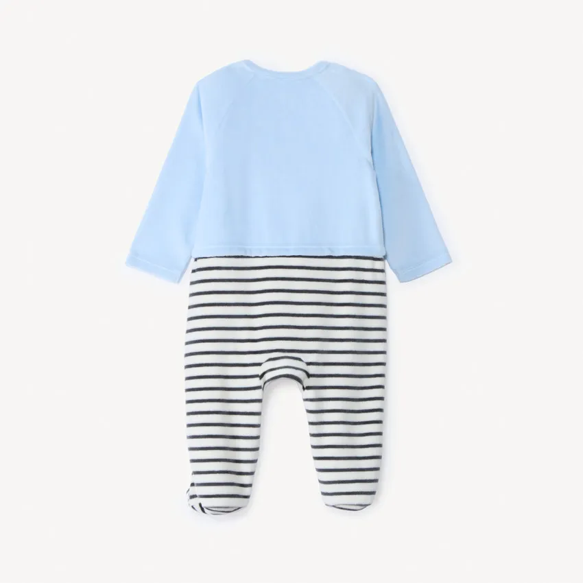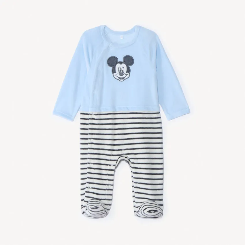 | Мягкий велюровый слип. Верх однотонного небесно-голубого цвета с контрастной вышивкой Микки Мауса спереди. Ниже талии полоски контрастного цвета по всей поверхности. Круглый вырез, застёжка на кнопки «кимоно» спереди, кнопки в промежности, закрытые стопы. |