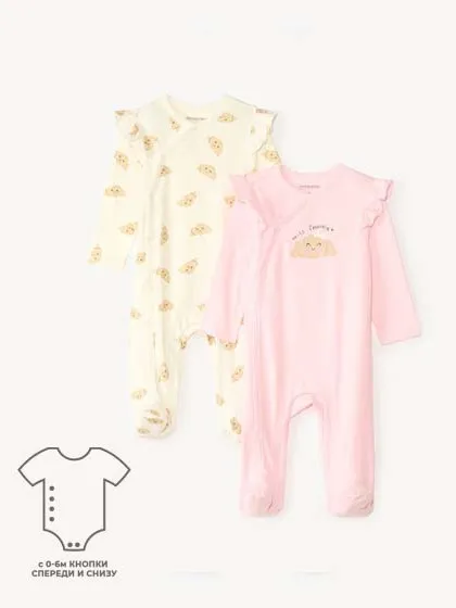 Комплект бренда Orchestra из двух комбинезонов-слипов с длинными рукавами для малышки. Для удобства переодевания предусмотрены разные виды застёжек в зависимости от размера: модели от 0 до 6 месяцев имеют застёжку спереди как у распашонки, а размеры от 9 до 36 месяцев — кнопки сзади на спине и на поясе.Ткань с составом 95% хлопок и 5% эластан приятна к телу, хорошо тянется и обеспечивает комфорт для малыша.