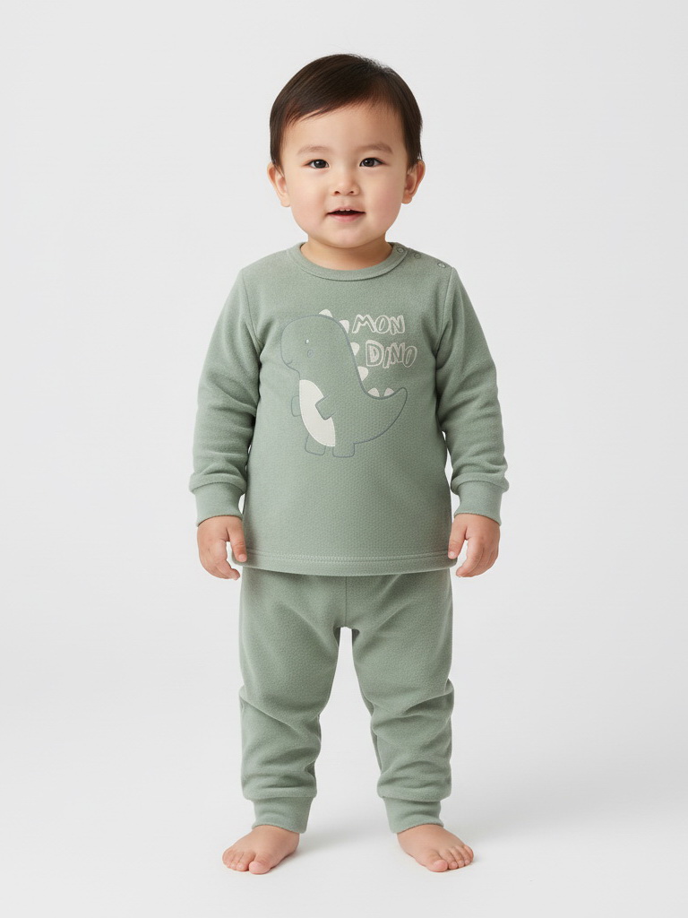 Модель украшена принтом по центру, а удобная застёжка на кнопки сзади на спине облегчает переодевание. Брюки с эластичным поясом на резинке обеспечивают комфортную посадку и свободу движений.