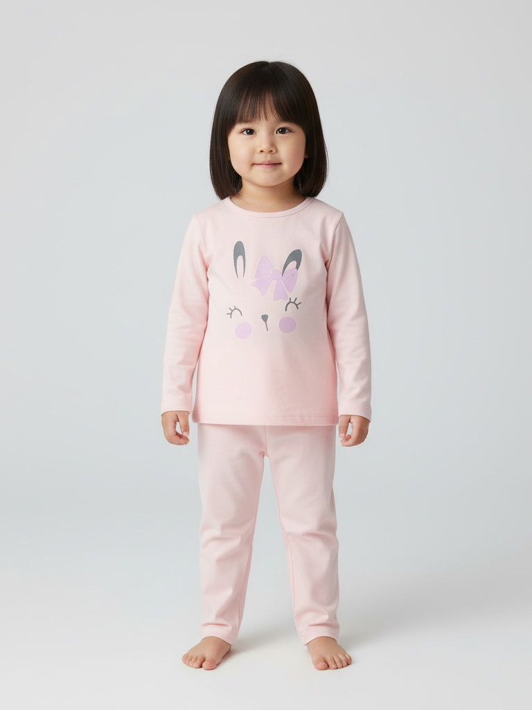 Футболка украшена милым рисунком с рожицей зайчика с блестящими деталями, который добавляет образу нежности и делает пижаму особенно привлекательной.