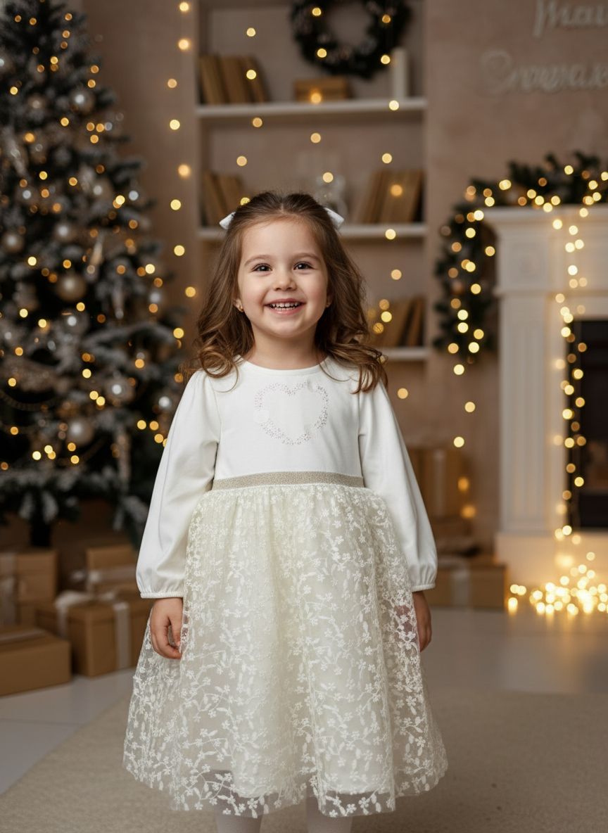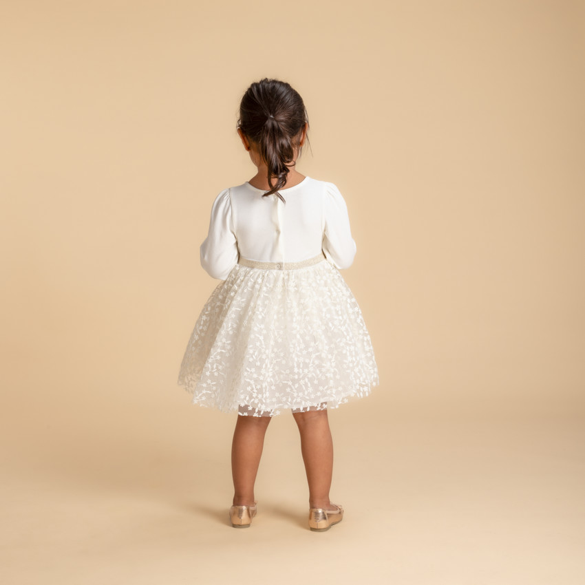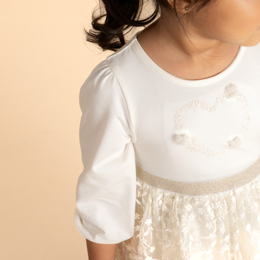 Двухцветное платье «2 в 1» в оттенке экрю сочетает изящный верх из крепа с длинными рукавами и пышный подол из вышитого тюля. Круглый вырез горловины и присборенные плечи подчёркивают элегантность модели. На передней части расположены декоративные сердечки в тон, украшенные объёмными узорами, блёстками и цветами. Спинка выполнена однотонной. Эластичный пояс с золотистым люрексом красиво выделяет талию, а многослойный подол с цветочной вышивкой в тон создаёт воздушный объём. Для комфорта предусмотрена лёгкая подкладка из шифона.