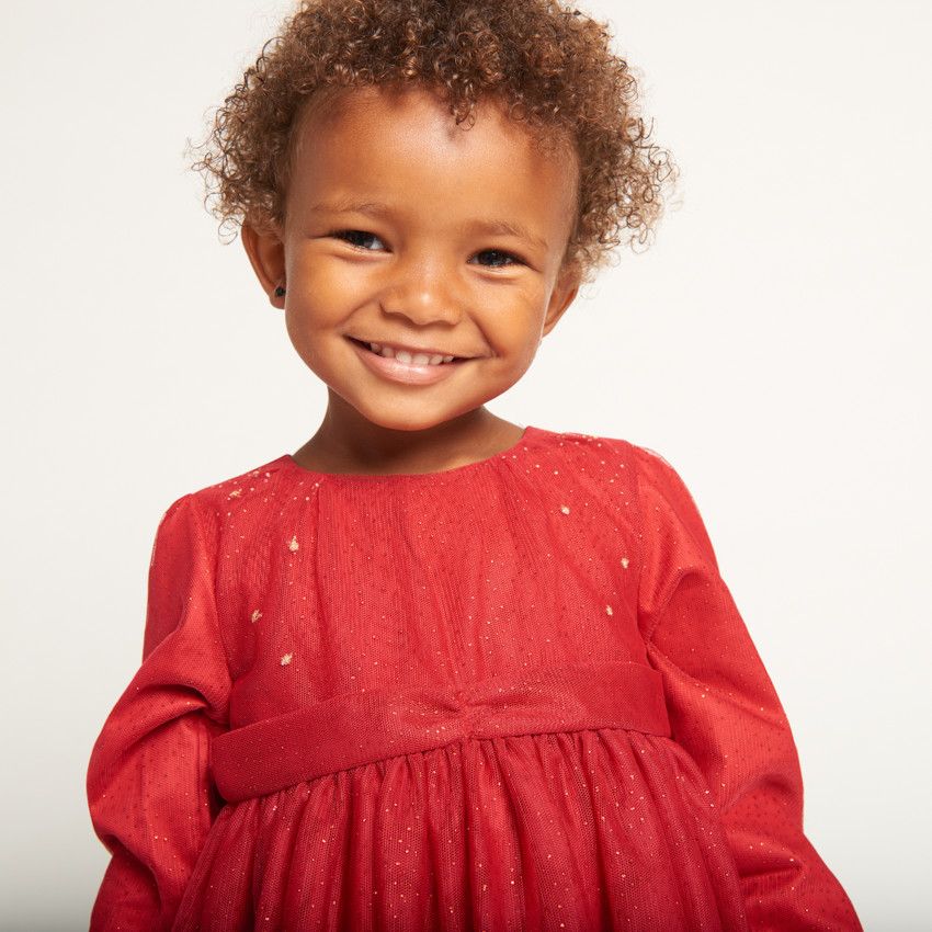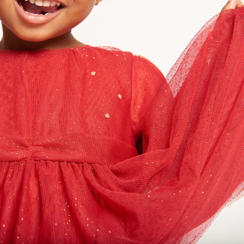 Платье выполнено из лёгкого и переливающегося тюля (100% полиэстер), который красиво держит форму и выглядит нарядно