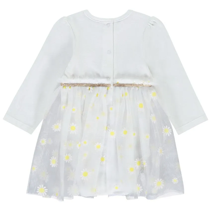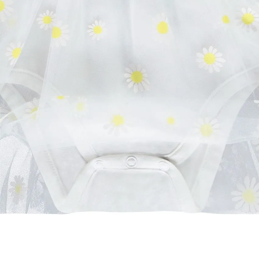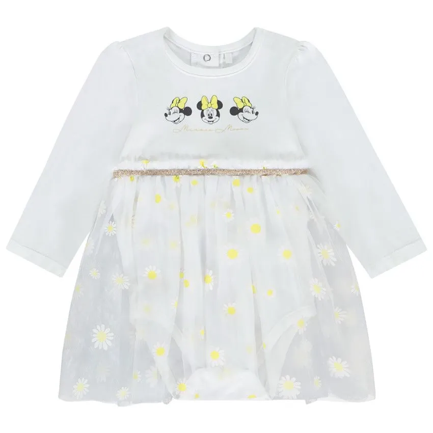 Очаровательное платье-боди для малышей с длинными рукавами. Верх выполнен из мягкого трикотажа белого цвета с милым принтом Минни Маус и декоративным поясом с блестящими вставками. Юбка из легкого тюля украшена ярким принтом в виде ромашек, создающим нежный и праздничный образ. Круглый вырез и застежка на кнопки сзади обеспечивают легкость при переодевании. Идеальный выбор для праздничных мероприятий или повседневных прогулок.