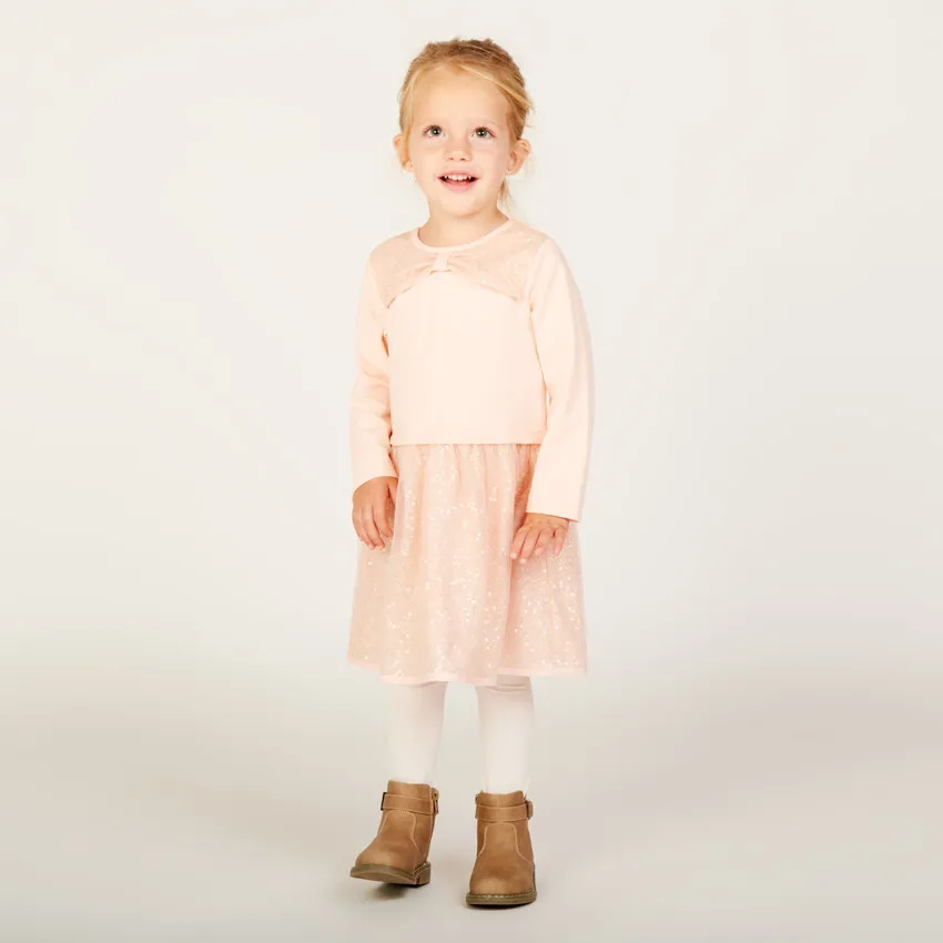 Нарядное платье для девочки — изящный вариант для особых случаев. В верхней части груди расположена тюлевая вставка с пайетками и декоративным бантом, создающая праздничный акцент. Удобная застёжка на кнопки в верхней части спины облегчает надевание. Пышная тюлевая юбка с пайетками придаёт образу лёгкость и торжественность.