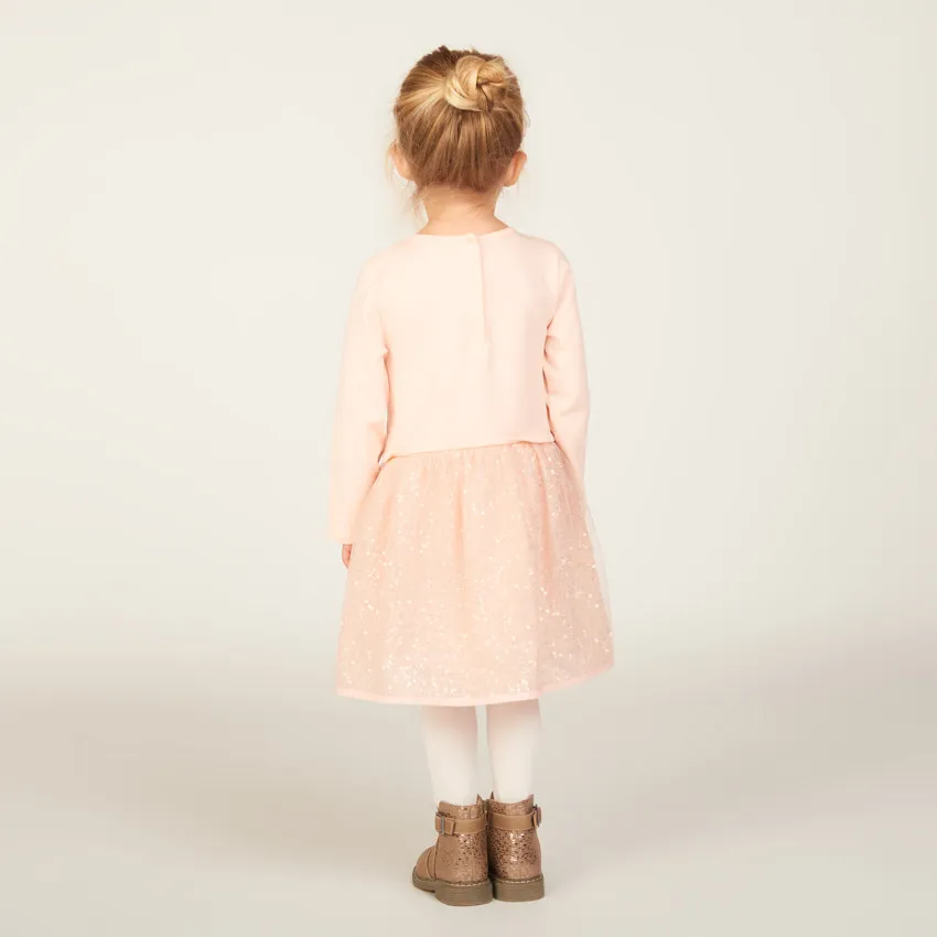 Нарядное платье для девочки — изящный вариант для особых случаев. В верхней части груди расположена тюлевая вставка с пайетками и декоративным бантом, создающая праздничный акцент. Удобная застёжка на кнопки в верхней части спины облегчает надевание. Пышная тюлевая юбка с пайетками придаёт образу лёгкость и торжественность.