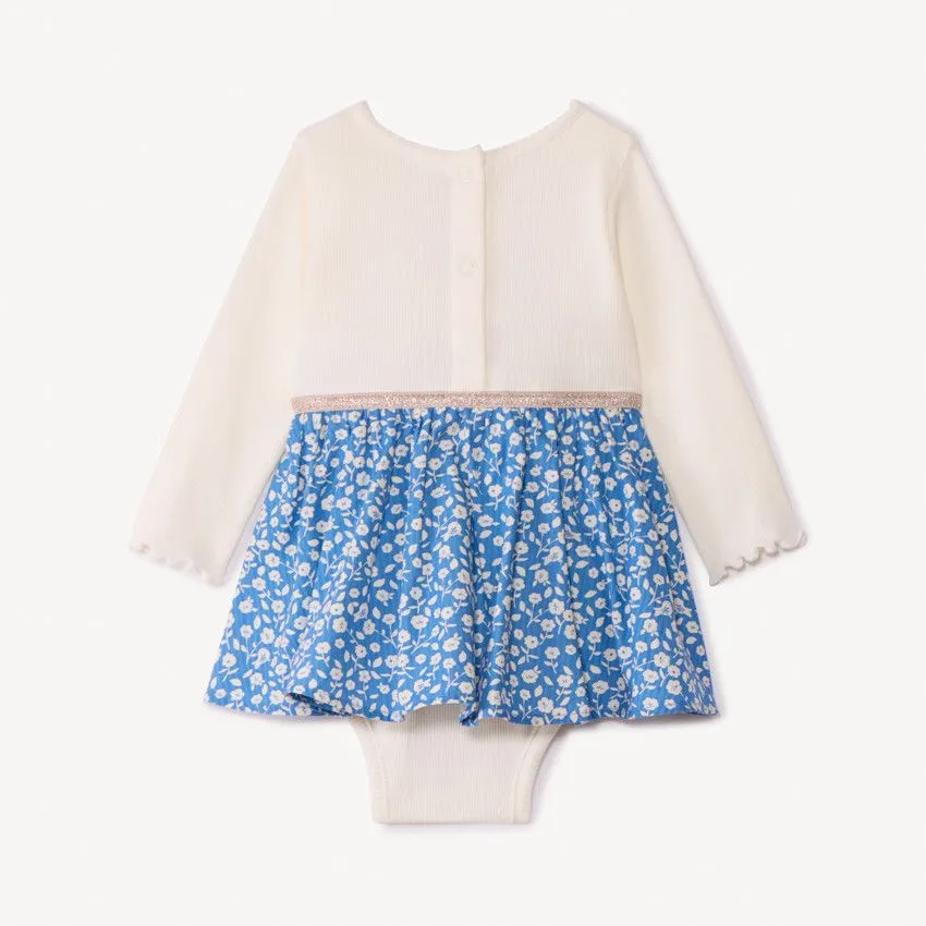 Нежное платье-боди с длинным рукавом и пышной юбочкой с ярким цветочным принтом. Застёжки расположены на спинке и внизу — для удобного переодевания и смены подгузника.