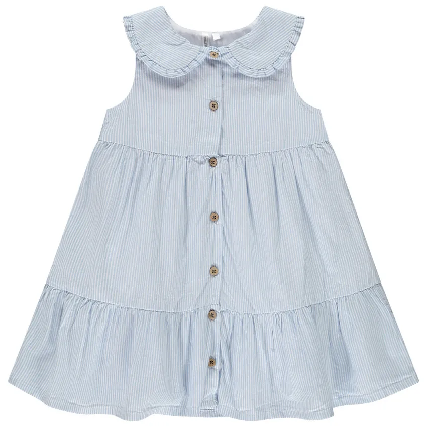 Платье украшено тонкими полосками по всей поверхности, что придаёт образу аккуратность и лёгкость. Классический воротничок с волнистыми краями добавляет модели особую нежность и очарование.