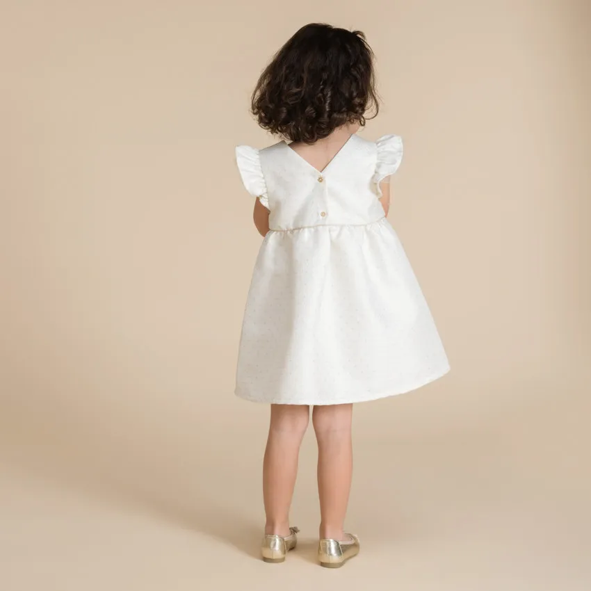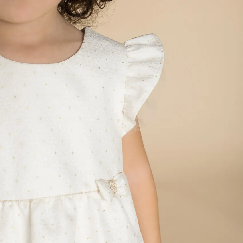 Платье с короткими рукавами из жаккарда кремового цвета. Тонкий цветочный узор с блестящими деталями, круглый вырез, спинка с V-образным вырезом и застёжкой на пуговицы в верхней части, золотые пуговицы в форме цветка. Рукава украшены оборками из тюля, талия собрана с блестящей отделкой, спереди маленький декоративный бантик. Нижняя часть расклешённая, с несколькими слоями тюля для объёма, подкладка из шифона.