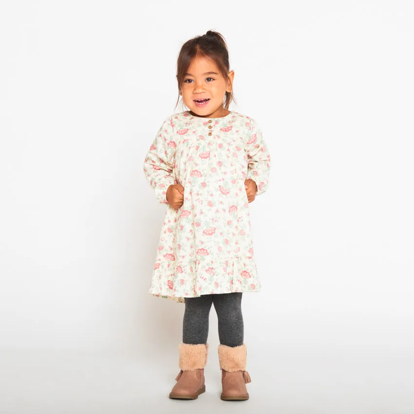 Платье из хлопковой ткани с длинными рукавами, выполненное в кремовом цвете с цветочным принтом по всей поверхности. Модель с круглым вырезом горловины, застёжкой на кнопки в верхней части спинки и декоративными кокосовыми пуговицами спереди. На лифе и по низу изделия расположены присборенные вставки, создающие лёгкий объём. Рукава пышной формы с эластичными манжетами. Внутренняя подкладка из мягкой газовой ткани обеспечивает дополнительный комфорт.