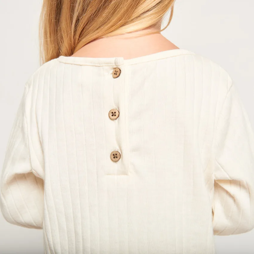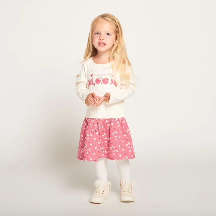 | Платье с комбинированным дизайном, создающим эффект «2 в 1». Верх выполнен из трикотажа в рубчик кремового цвета с длинными рукавами и круглым вырезом горловины. На спинке — застёжка на кокосовые пуговицы. Перед украшен контрастной вышивкой и аппликациями с фантазийной надписью «Turn florecer». Талия присборена, создавая женственный силуэт. Нижняя часть — лёгкая газовая юбка сливового цвета с цветочным принтом по всей поверхности. Спинка однотонная. |