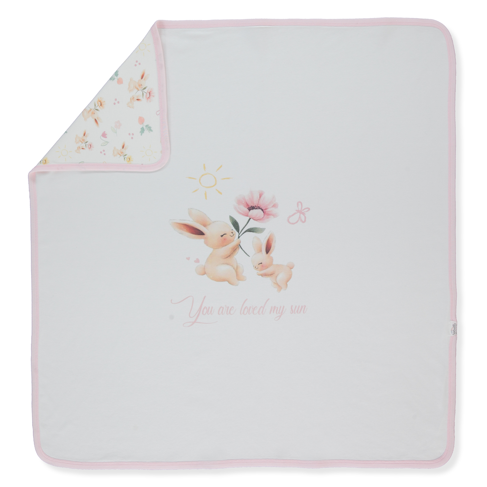 Модель украшена нежным принтом с зайчиками и цветком в пастельных оттенках, создающим тёплое и трогательное настроение.