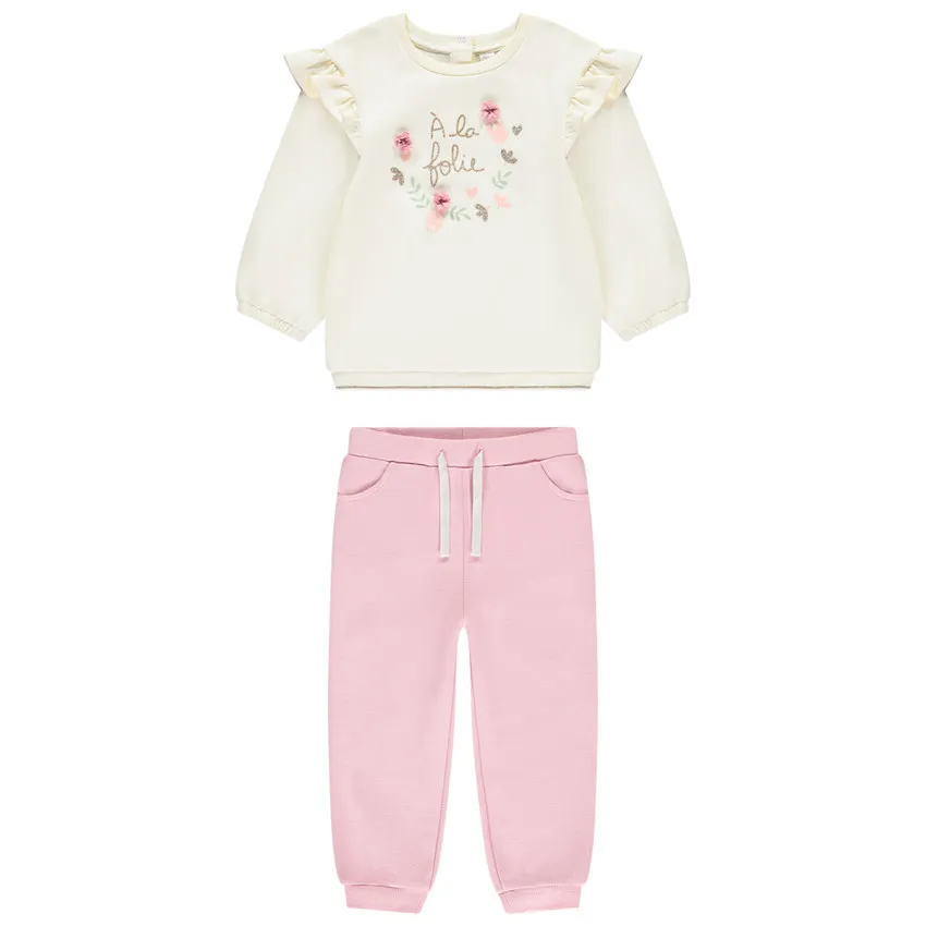 Комплект из мягкой флисовой ткани: свитшот и спортивные брюки. Свитшот кремового цвета с объёмной вышивкой и 3D-цветами спереди, украшен блестящей надписью золотистого цвета. По проймам — декоративные воланы. Круглый ворот из трикотажа в рубчик, манжеты и низ на резинке. На спинке — застёжка на кнопки. Спинка однотонная, без декора. Брюки розового цвета с мягким поясом на резинке и контрастной завязкой. Спереди — два кармана. Низ штанин — на резинке. Спинка без оформления. Уютный и нарядный вариант для повседневной носки.