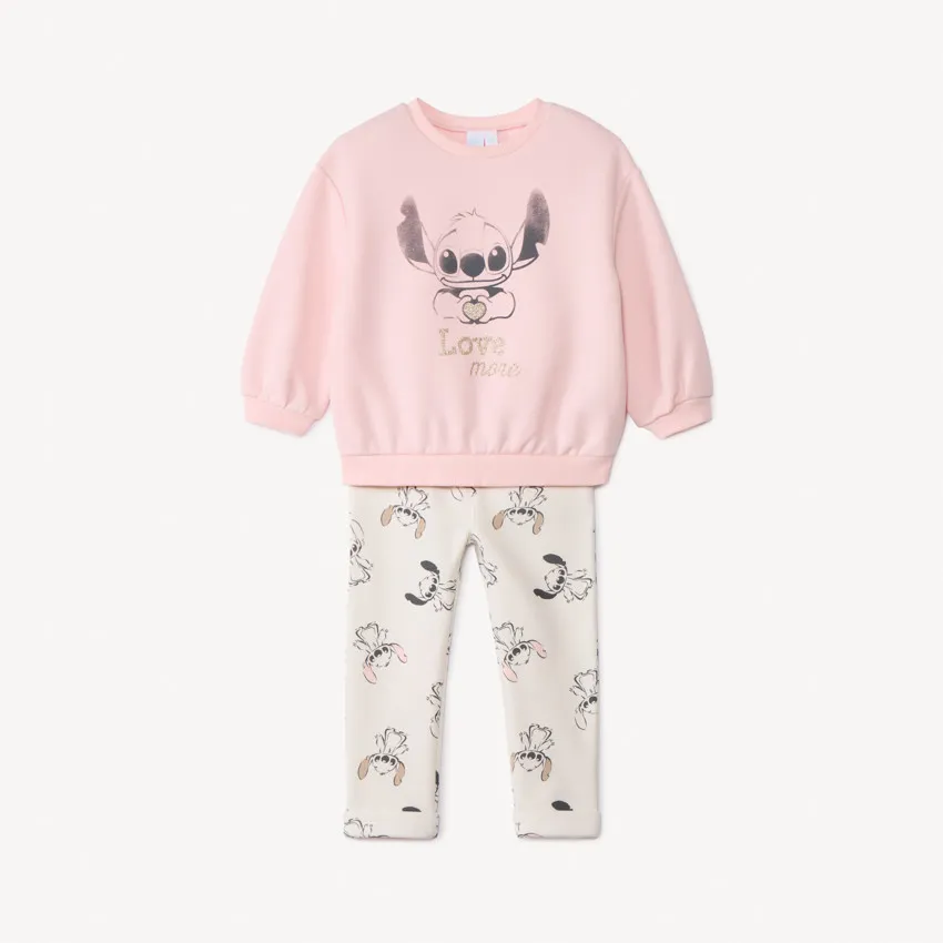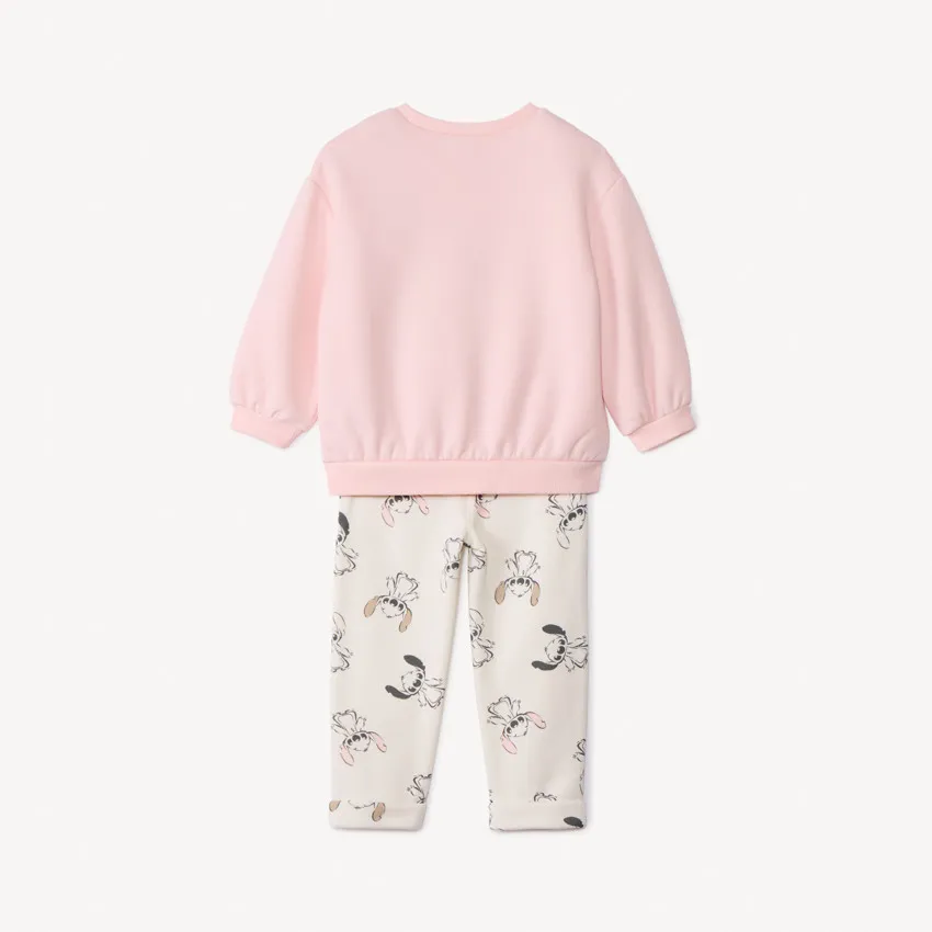 Брюки из кремового флиса с контрастным принтом Stitch по всей поверхности, эластичная талия со шнурком из золотистого люрекса, два боковых кармана.