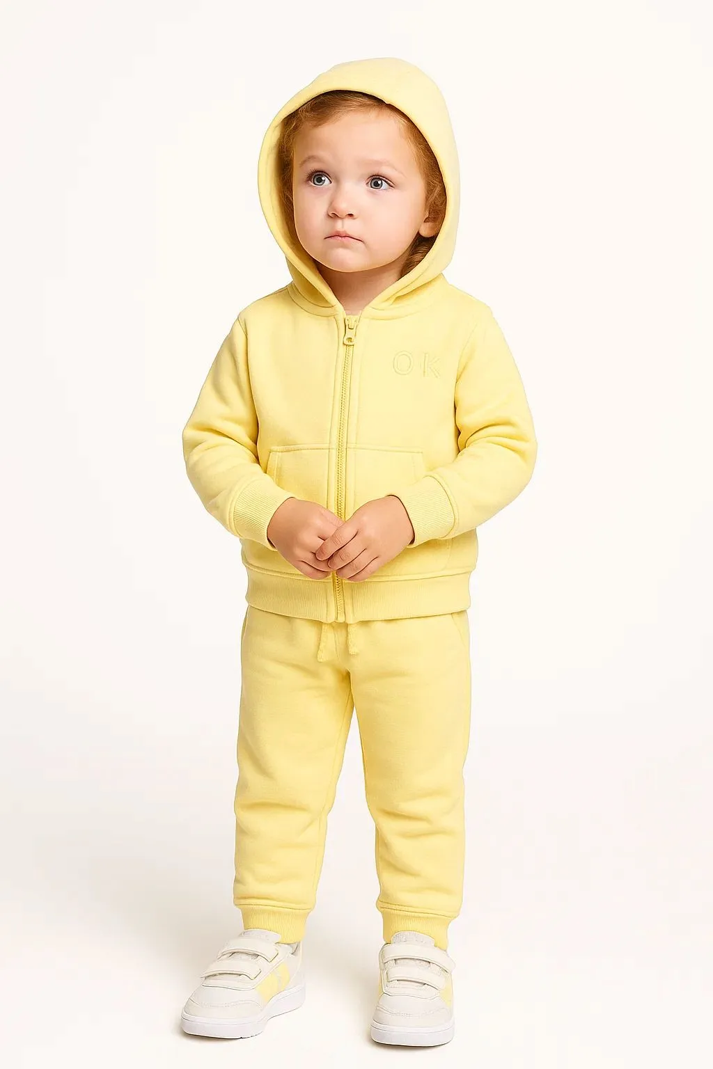 Детский спортивный костюм из мягкого хлопкового трикотажа. В комплект входит толстовка с капюшоном на молнии и накладными карманами, а также брюки с эластичным поясом на кулиске и манжетами по низу. Удобный и практичный вариант для прогулок и повседневного ношения.