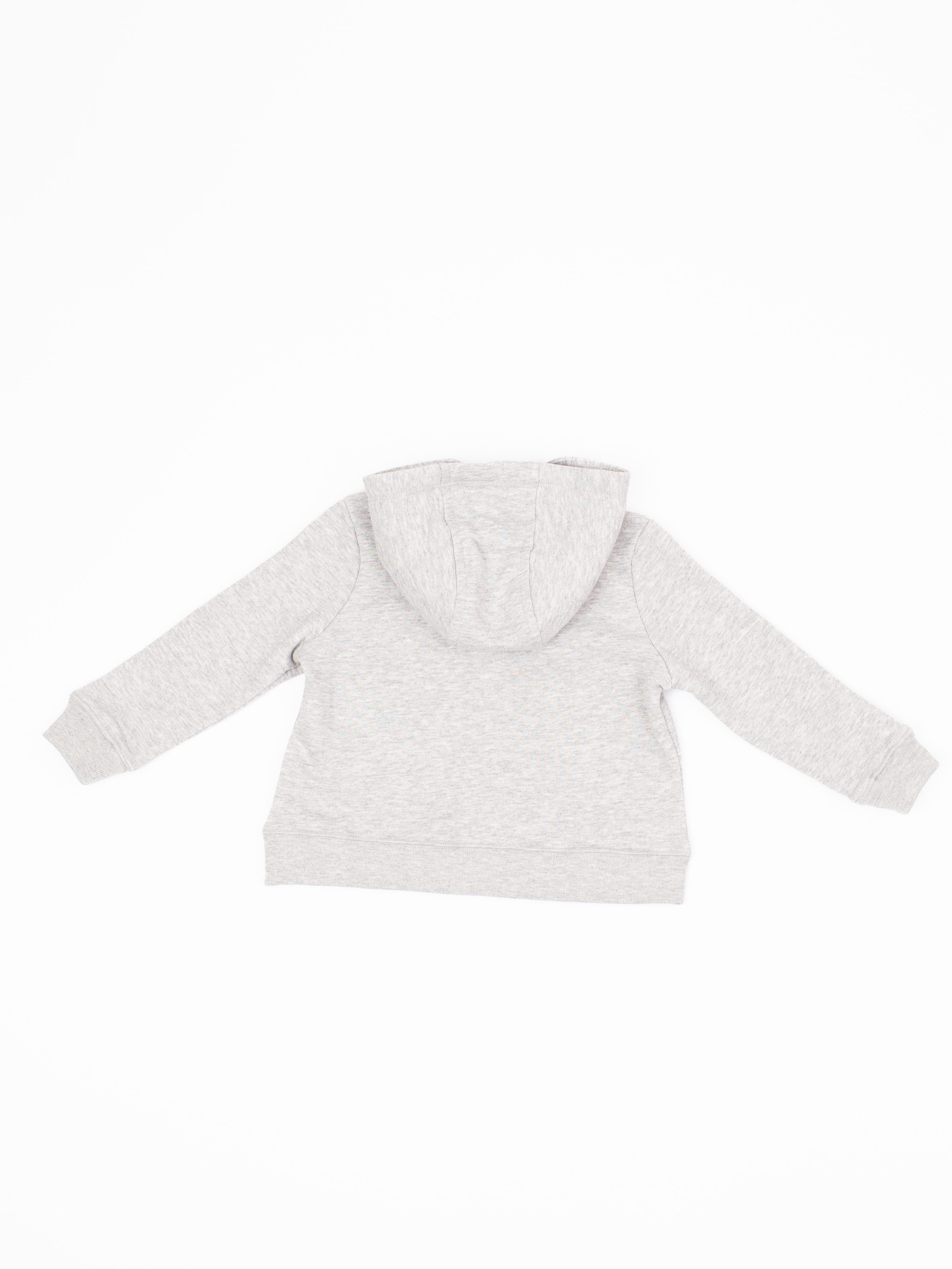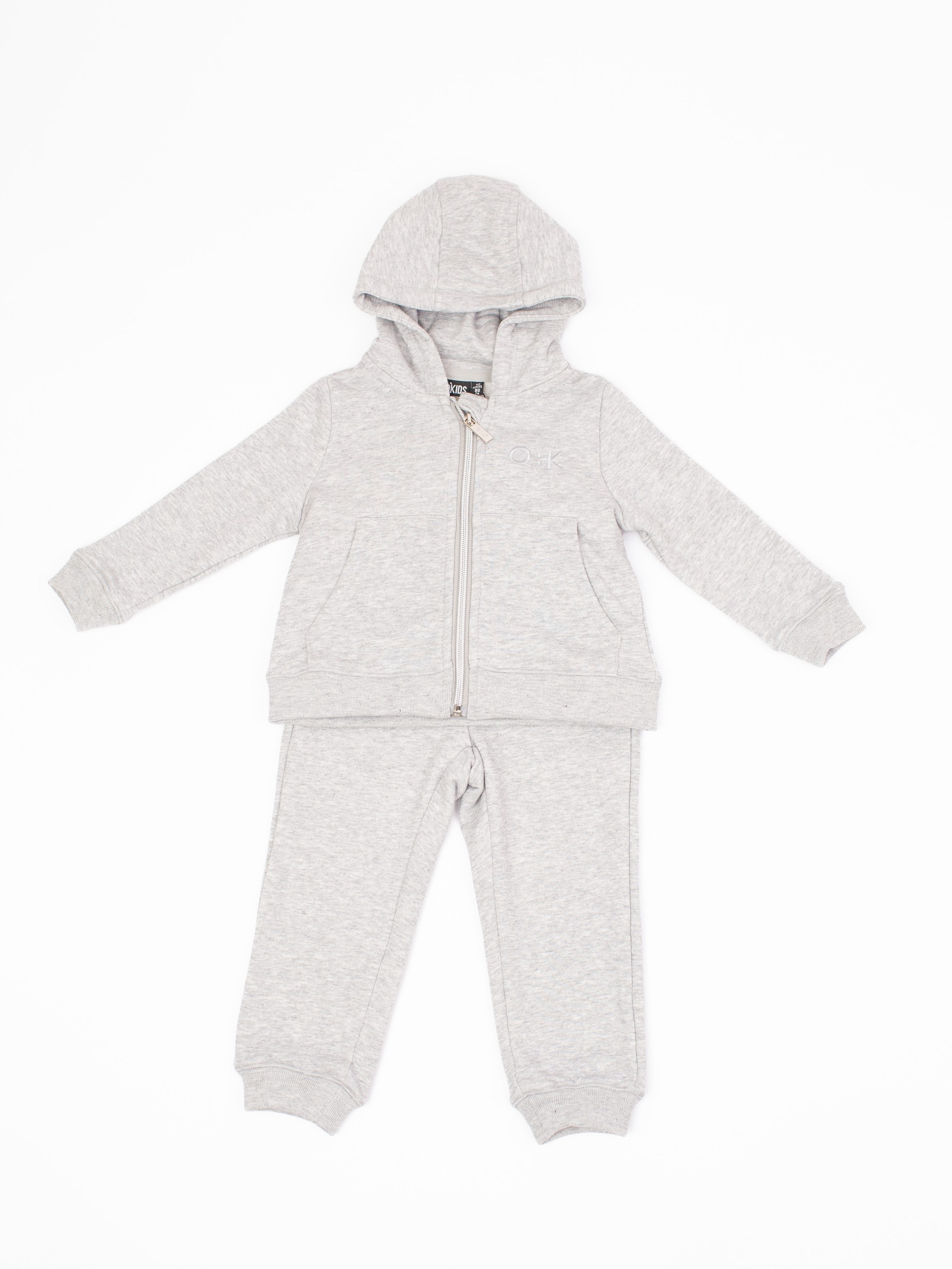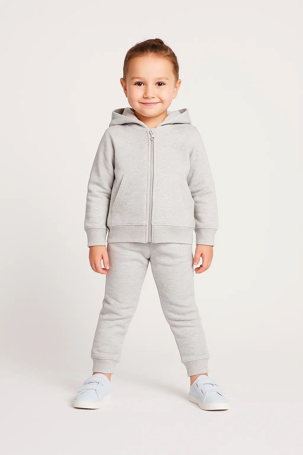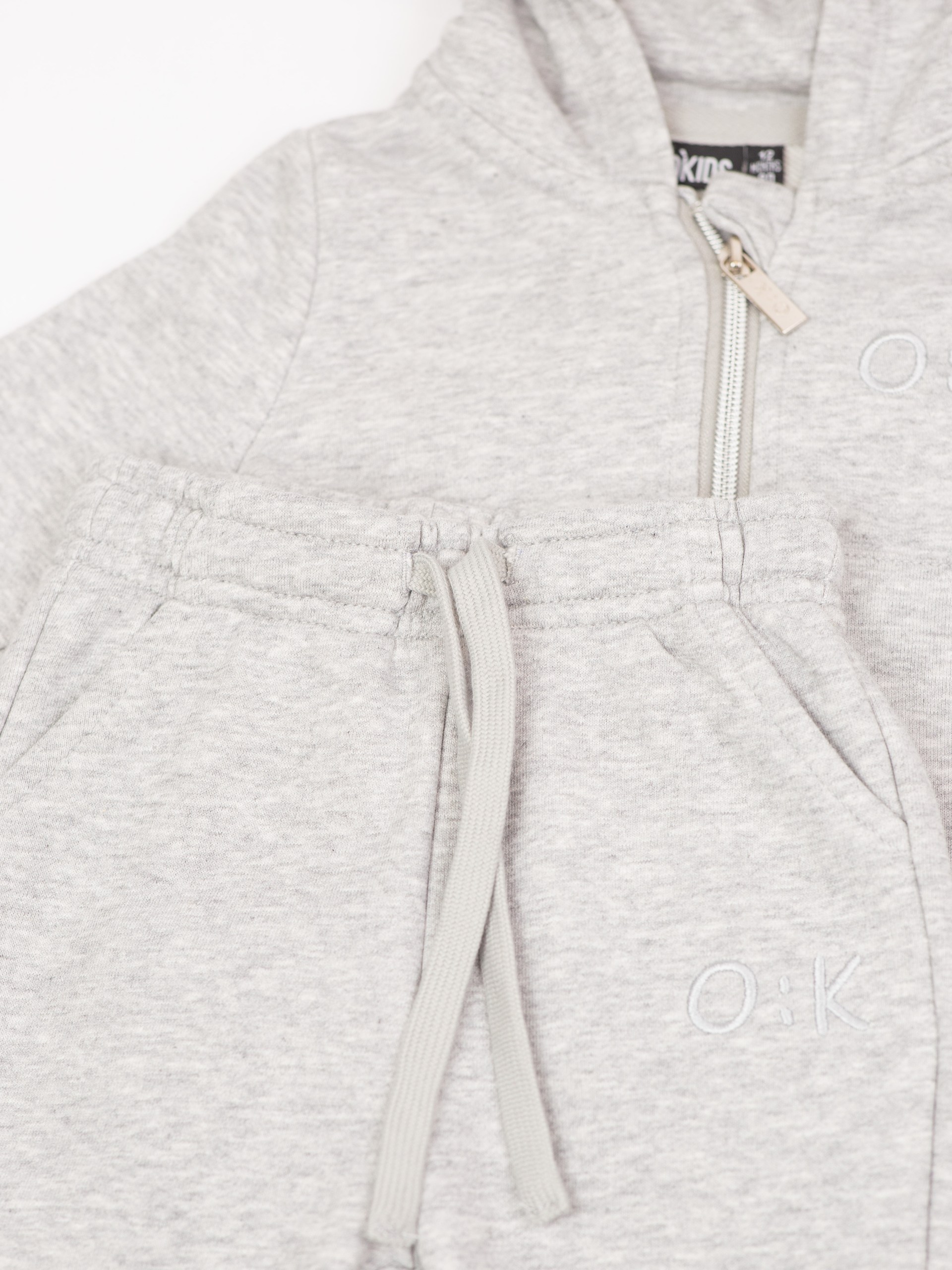 Детский спортивный костюм из мягкого хлопкового трикотажа. В комплект входит толстовка с капюшоном на молнии и накладными карманами, а также брюки с эластичным поясом на кулиске и манжетами по низу. Удобный и практичный вариант для прогулок и повседневного ношения.