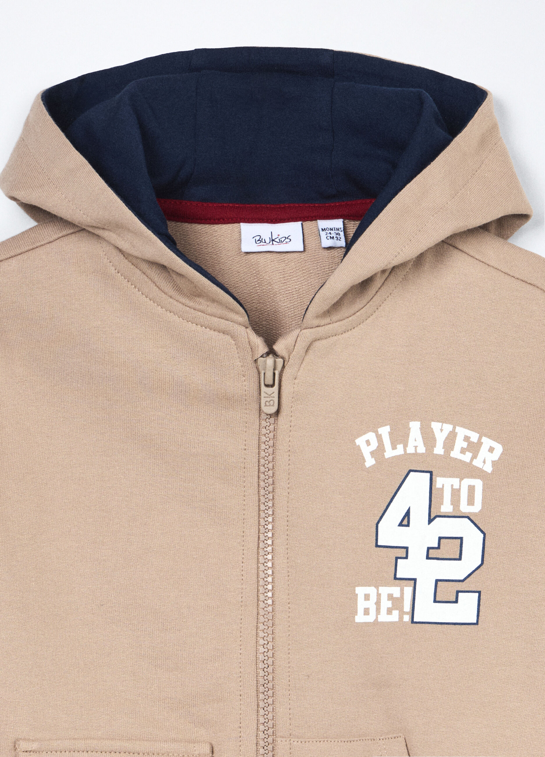Толстовка на молниим с манжетами и подолом в рубчик обеспечивает удобную посадку и защиту от прохлады. Брюки с эластичной талией на резинке и шнурком создают дополнительный комфорт и свободу движений.