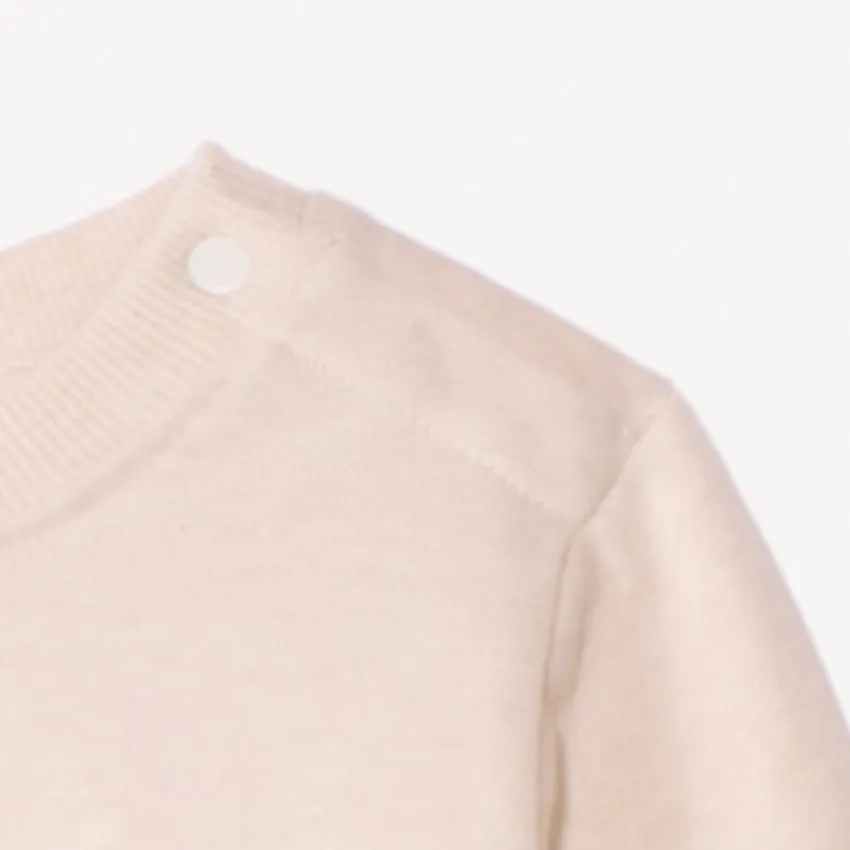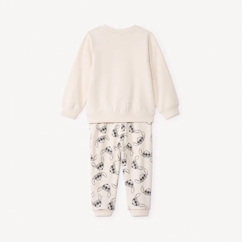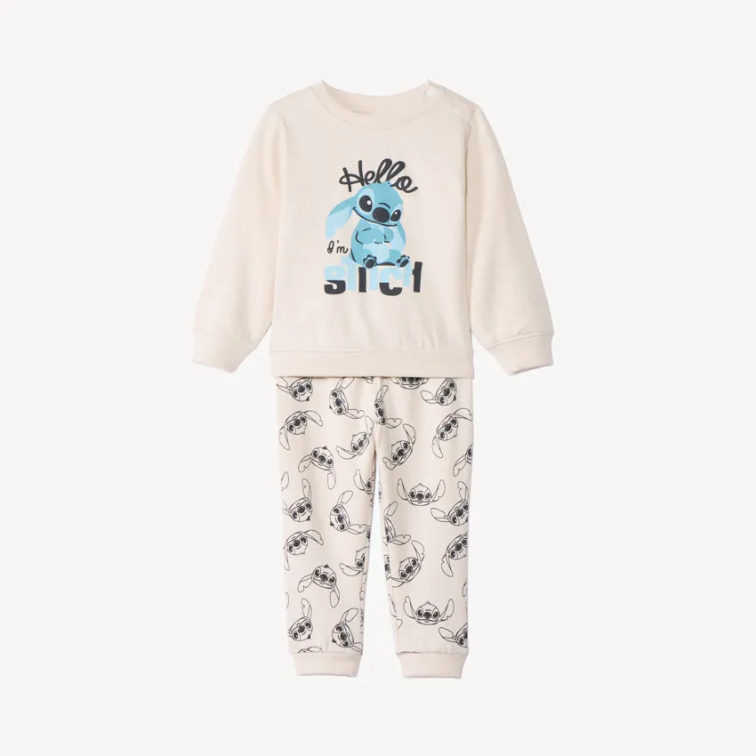 Спортивный костюм на тему Stitch (Disney) из мягкого трикотажа. Свитшот кремового цвета с круглым вырезом и застёжкой на кнопки на плече, спереди комбинированный принт Stitch (soft print и puff print), манжеты и низ на эластичной резинке, спинка однотонная.