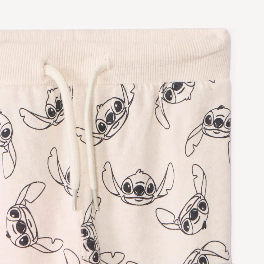 Брюки кремового цвета с контрастным принтом Stitch по всей поверхности, эластичная плоская талия с шнурком, манжеты в рубчик.