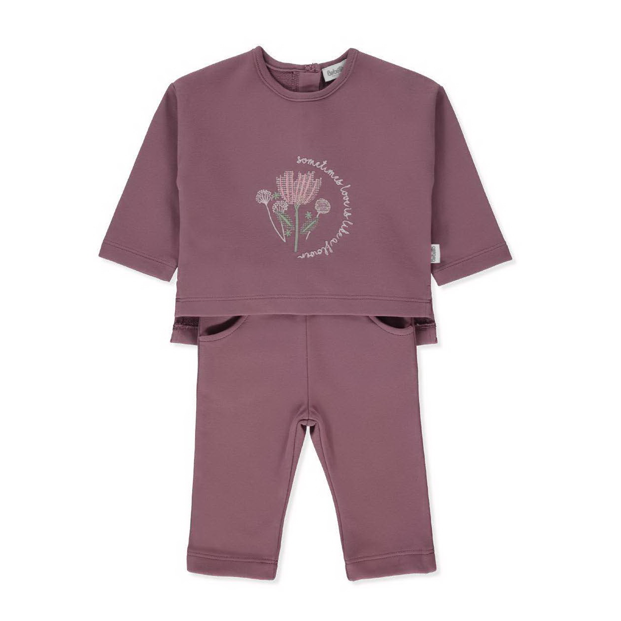 | Спортивный костюм для малышек из мягкой ткани. Мягкая кофта с милым цветочным принтом на груди, застёжкой на кнопках сзади и слегка удлинённой спинкой для большего комфорта. Брюки с открытыми ножками и удобными карманами. Костюм идеально подойдёт для прогулок, сна и первых движений малыша. |