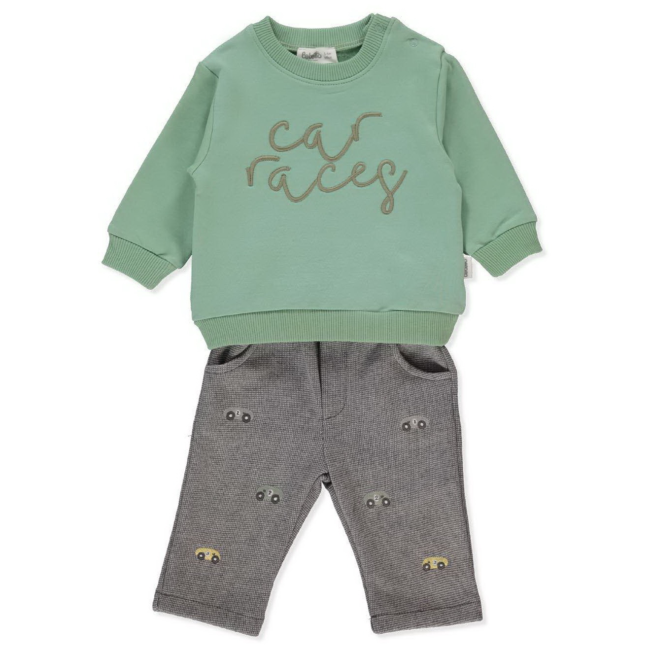 Спортивный костюм для малыша состоит из однотонной кофты и брюк с ярким принтом машинок. Кофта украшена вышивкой-надписью, а также дополнена резинкой по нижнему краю и на рукавах для лучшей посадки и уюта. Штанишки на удобной резинке, обеспечивающей свободу движений. Отличный вариант для прогулок и активного дня.