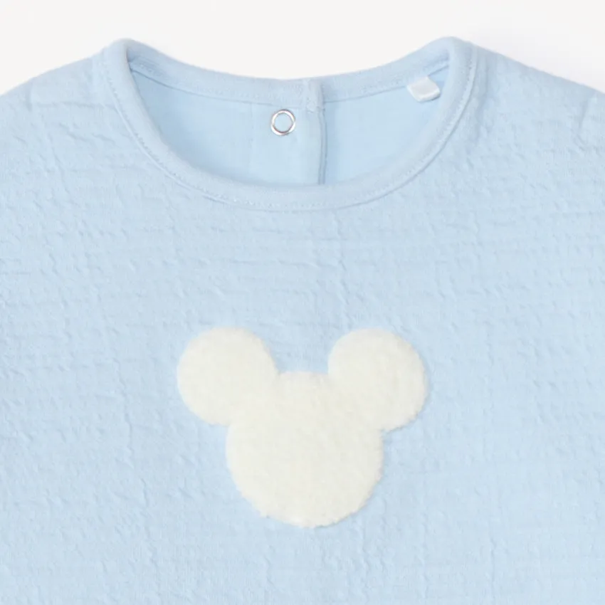 | Спортивный костюм из мягкого флисового трикотажа с рисунком «Микки Маус».Свитшот однотонного синего цвета, круглый вырез, застёжка на кнопки на спинке, спереди контрастная аппликация Микки с эффектом 3D, длинные рукава, манжеты и низ на эластичной резинке. Брюки кремового цвета с рисунком Микки по всей поверхности, эластичная талия с регулируемой длиной, манжеты из эластичной резинки. |