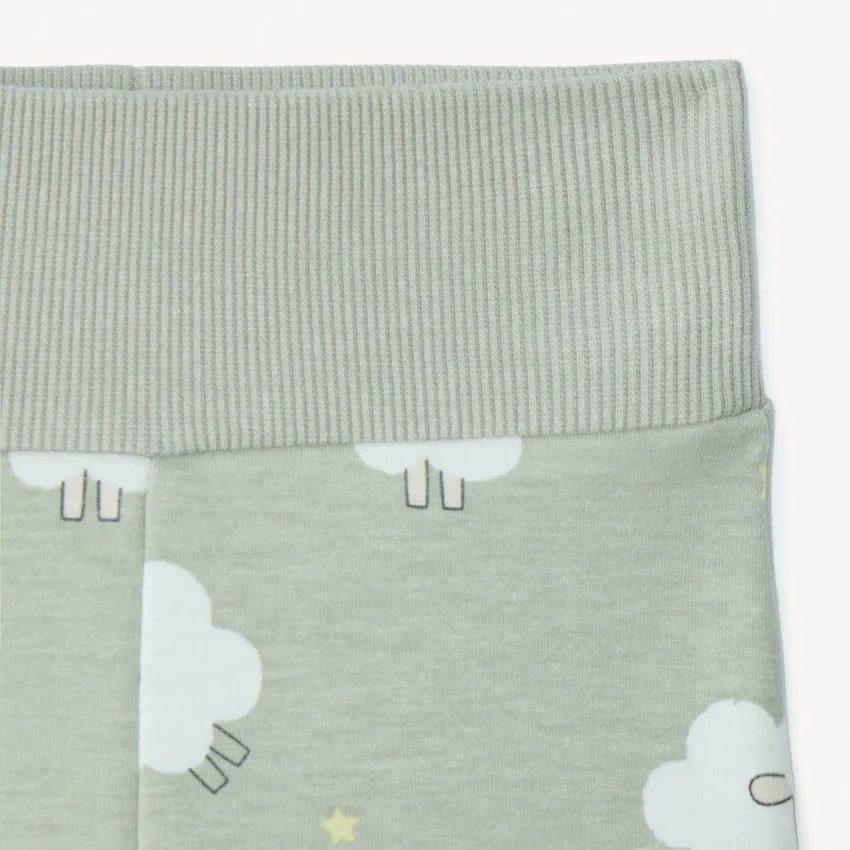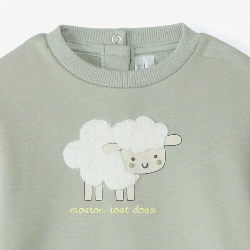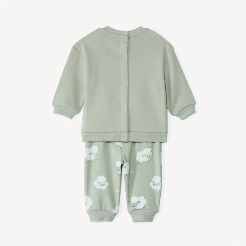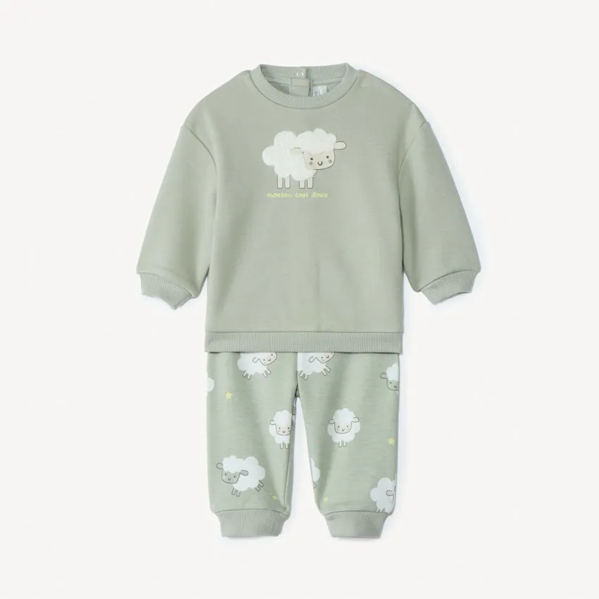 Спортивный костюм для малыша — мягкий, уютный и идеально подходящий для активных и спокойных дней. Нежный мятно-зелёный оттенок смотрится свежо и нейтрально, а забавный принт с овечками добавляет образу игривости и тепла. Верх выполнен в виде свитшота с мягкими манжетами и объёмной аппликацией, а удобная застёжка на кнопках по спинке облегчает переодевание. Брюки на комфортной резинке не сковывают движения и надёжно держатся на талии. Внутренняя сторона костюма — мягкая, нежная, созданная для максимального комфорта кожи малыша. Прекрасный комплект на прогулки, игры и домашние объятия — тёплый, практичный и очень милый.