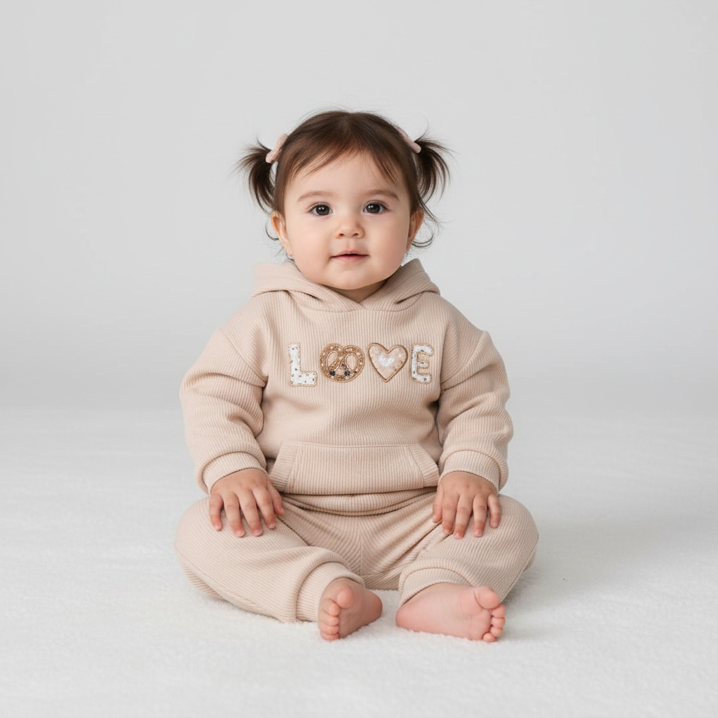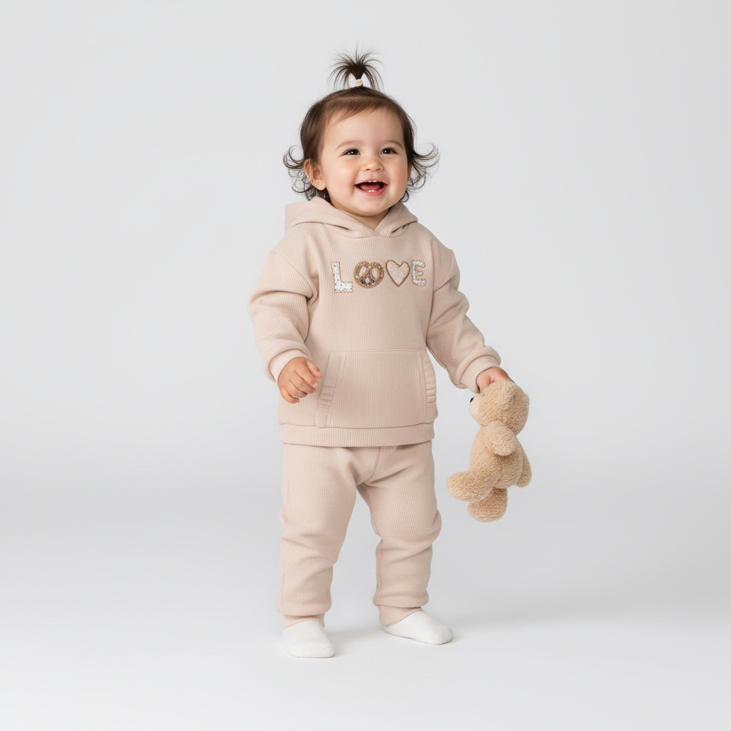 Спортивный комплект из текстурного велюра для девочек — уютный и стильный вариант для прогулок и игр. Худи оверсайз легко надевать через голову, с капюшоном, опущенными плечами и манжетами с низом из эластичного трикотажа. На груди декоративная надпись «love» с люрексом, спереди карман-кенгуру с аккуратной оборкой.