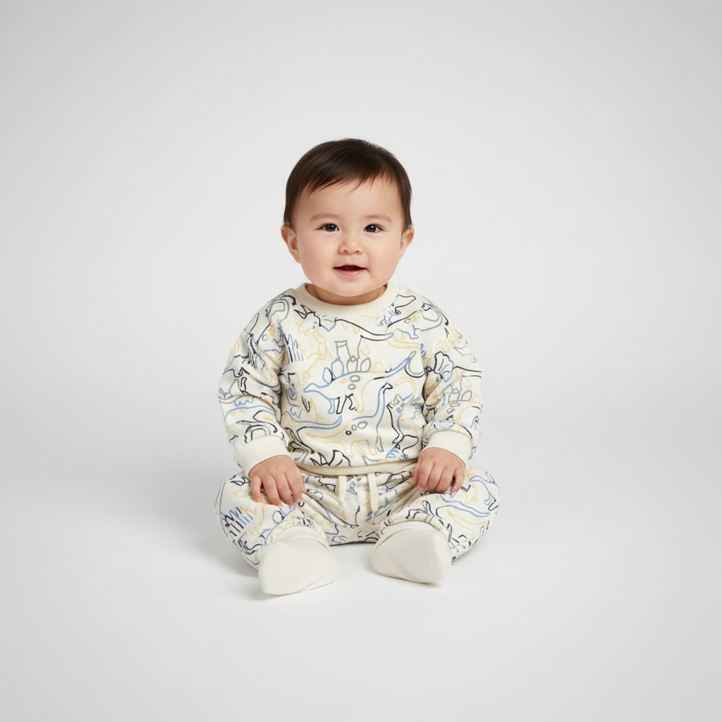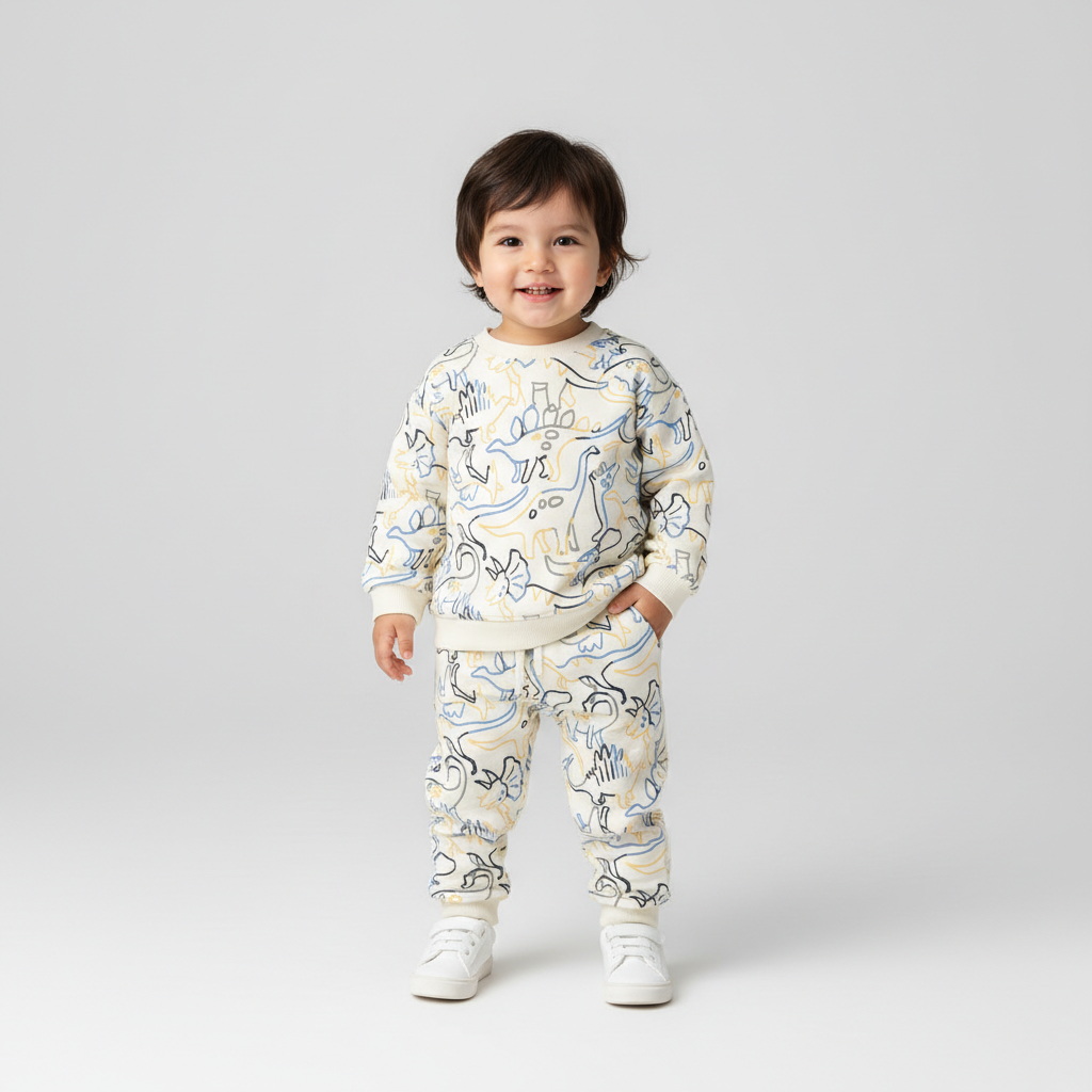 Спортивный костюм из мягкого футера для малышей с принтом динозавров по всей поверхности — отличный выбор для прохладных дней, прогулок и активных игр. Тёплый и приятный на ощупь материал сохраняет комфорт, а свободный крой не сковывает движений. Свитшот оверсайз с опущенными плечами и круглым вырезом с гладкой окантовкой, манжеты и низ оформлены эластичной окантовкой. Брюки с эластичным поясом и регулируемым шнурком, боковыми карманами и аккуратными манжетами.