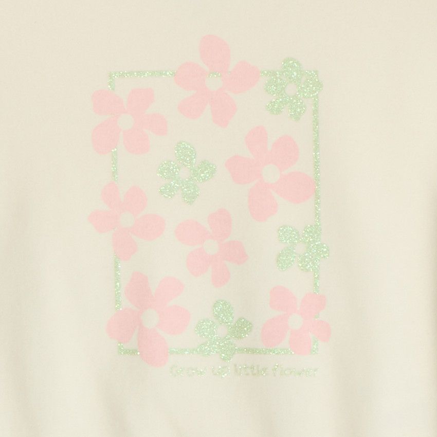 Свитшот выполнен из мягкого хлопкового полотна с добавлением полиэстера, приятен к телу и хорошо держит форму. Акцент — рукава-фонарики, придающие образу нежность и аккуратный объём. По центру расположен яркий принт с блесками, который добавляет образу игривости и праздничного настроения.