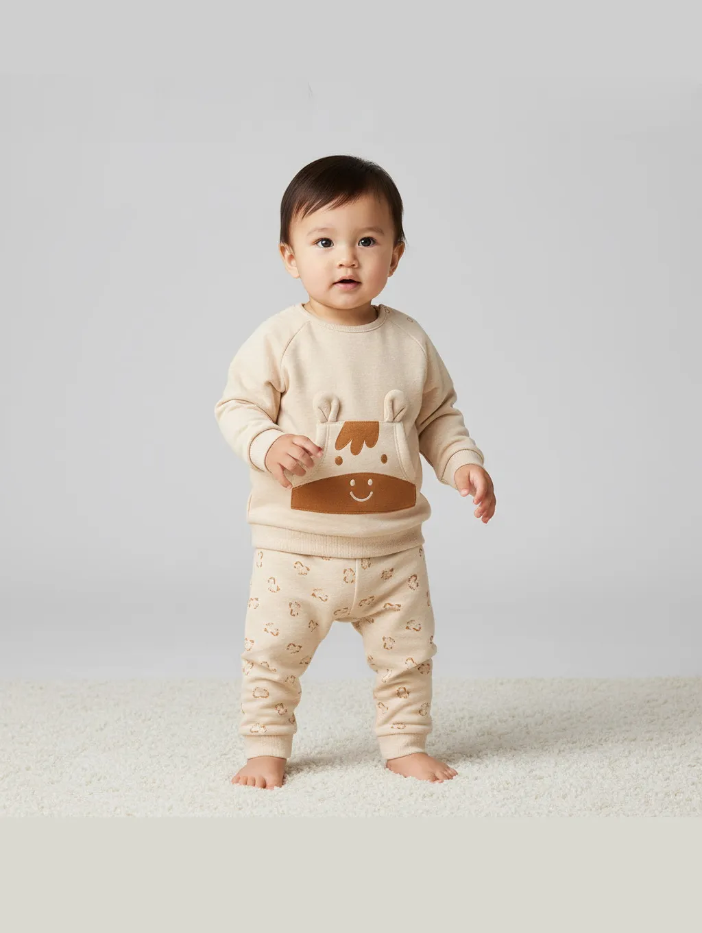 Свитшот с милой рожицей на кармане-кенгуру добавляет образу игривый акцент, а застёжка на кнопках на спинке облегчает процесс одевания. Брюки на эластичной резинке с манжетами обеспечивают удобную посадку и не сковывают движения ребёнка.