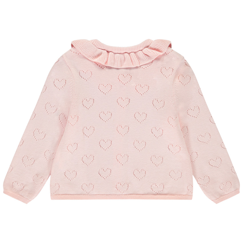 | Кардиган с длинными рукавами из мягкого трикотажа. Однотонная модель с ажурным узором в виде сердечек по всей поверхности. Круглый вырез украшен воланом из трикотажа спереди и сзади. Застёжка спереди на декоративные пуговицы. Манжеты и низ — в рубчик для комфортной посадки. Идеальный вариант для нежного и уютного образа. |