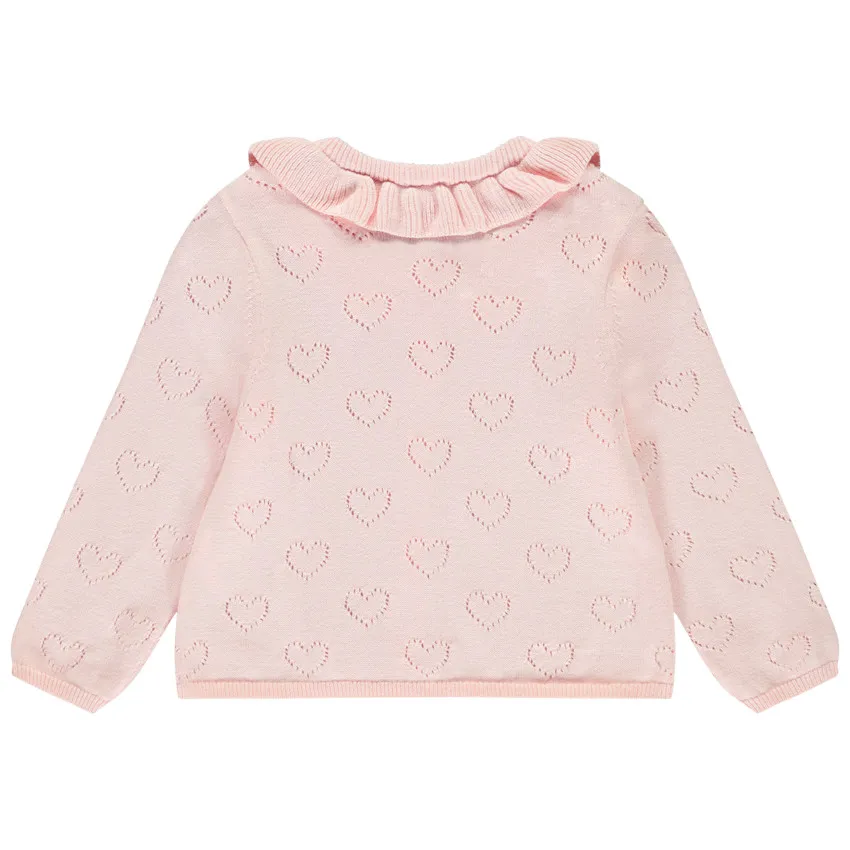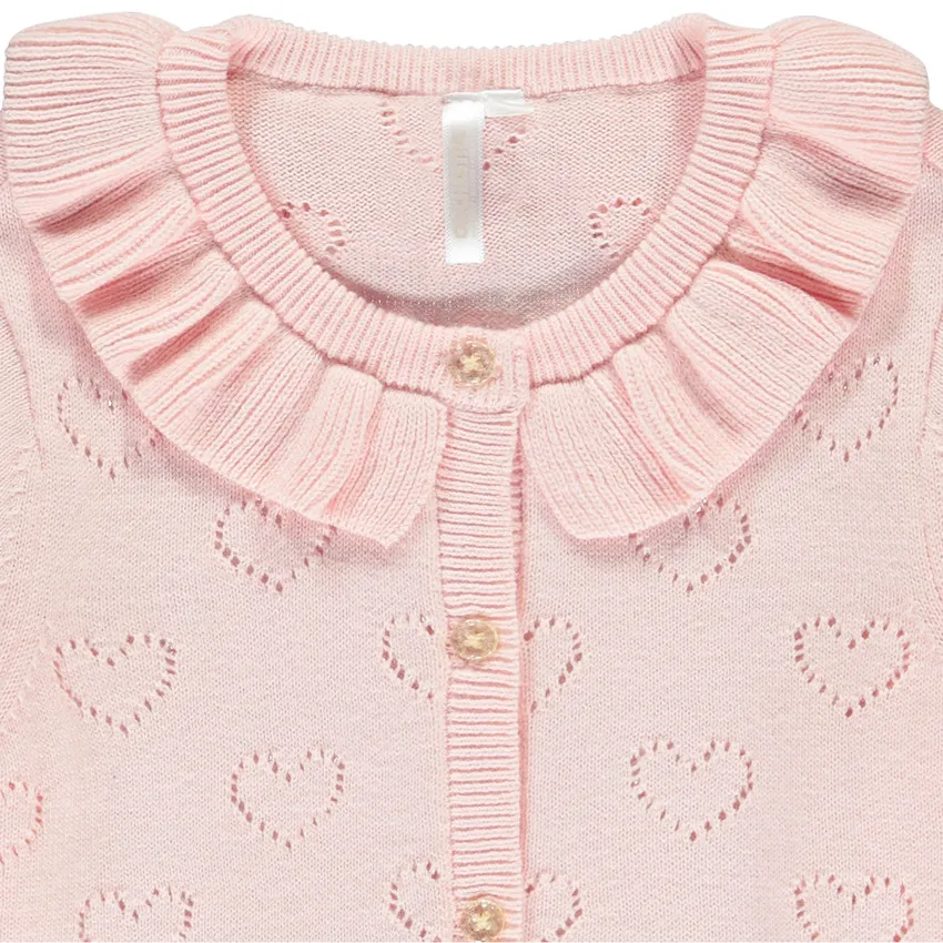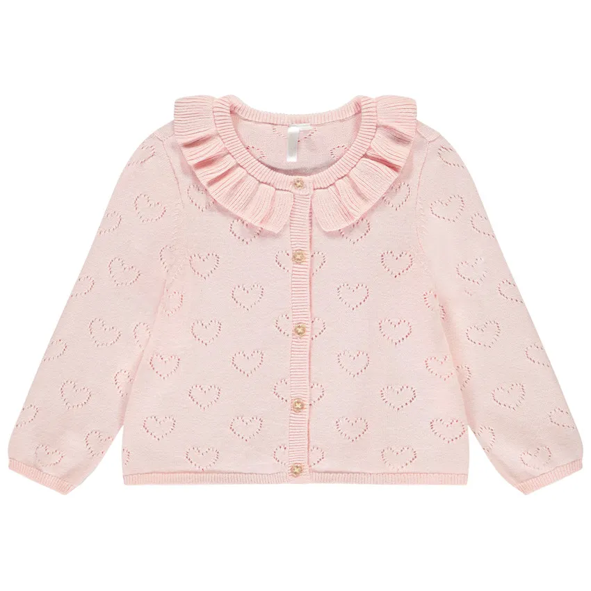 Кардиган с длинными рукавами из мягкого трикотажа. Однотонная модель с ажурным узором в виде сердечек по всей поверхности. Круглый вырез украшен воланом из трикотажа спереди и сзади. Застёжка спереди на декоративные пуговицы. Манжеты и низ — в рубчик для комфортной посадки. Идеальный вариант для нежного и уютного образа.