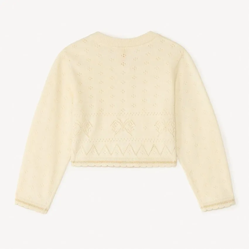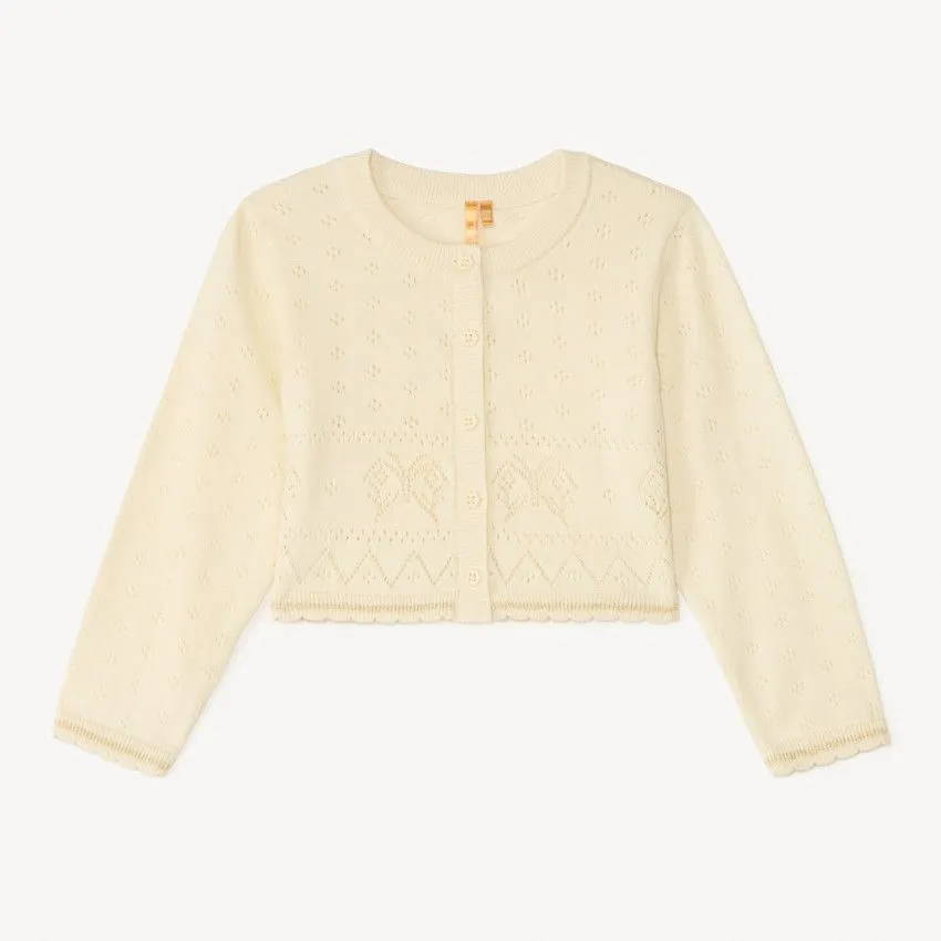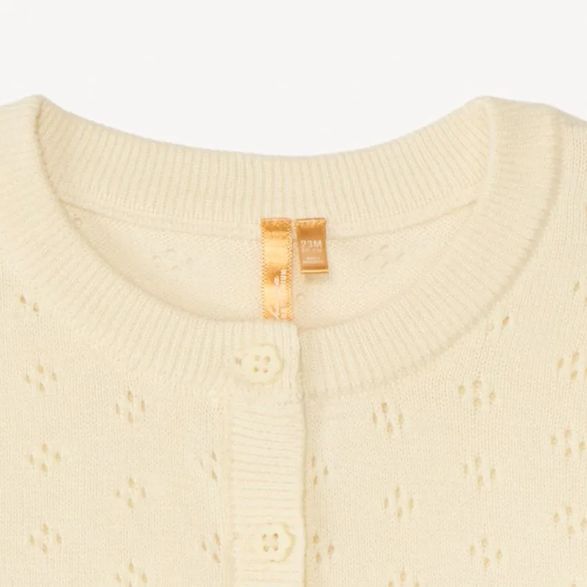 Кардиган выполнен из 100% хлопка, мягкий и приятный к телу. Ажурная вязка придаёт изделию лёгкость и аккуратный декоративный акцент. Удобная застёжка на пуговицы позволяет легко надевать и снимать кардиган, не доставляя дискомфорта ребёнку.