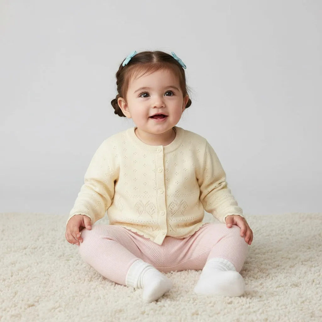Отлично подойдёт для прохладной погоды, сочетаясь с платьями, боди и комплектами для прогулок и дома.
