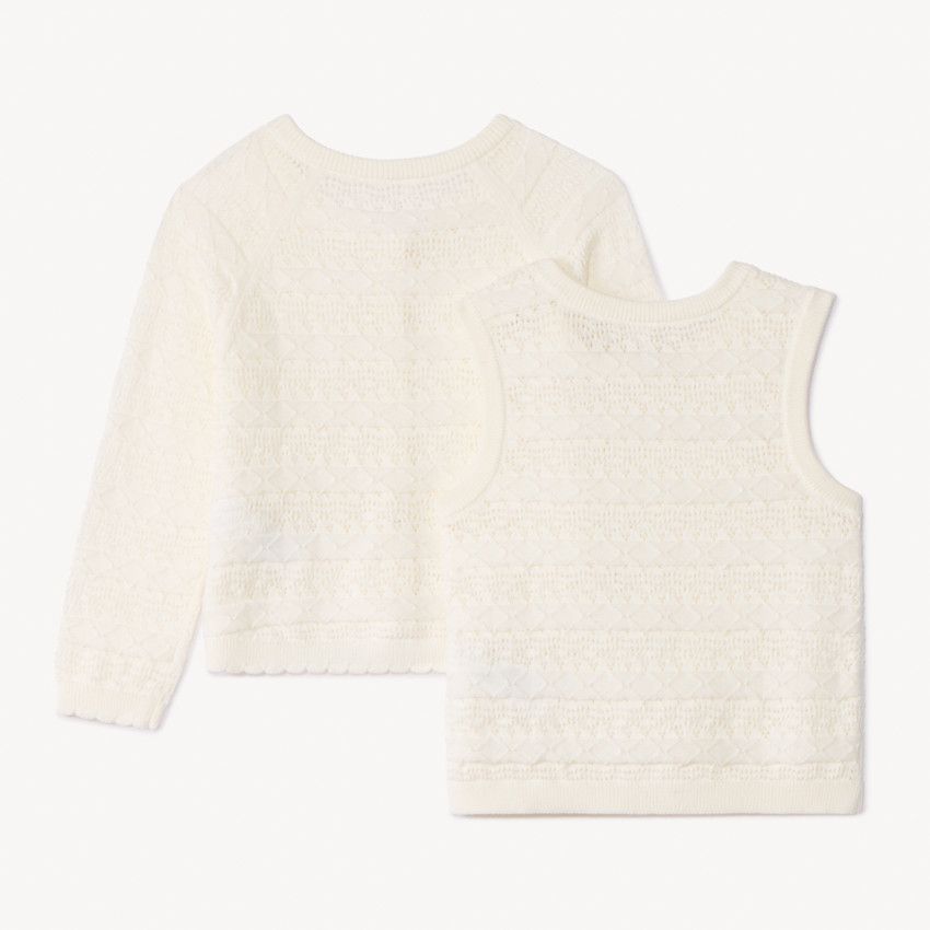 Уютный и стильный комплект из 100% хлопка включает в себя вязаный кардиган с длинными рукавами и застёжкой на пуговицы, а также жилетку с пуговицей сверху. Натуральный материал мягкий, дышащий и приятный к телу, обеспечивая комфорт на весь день.