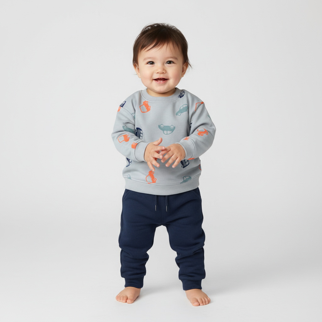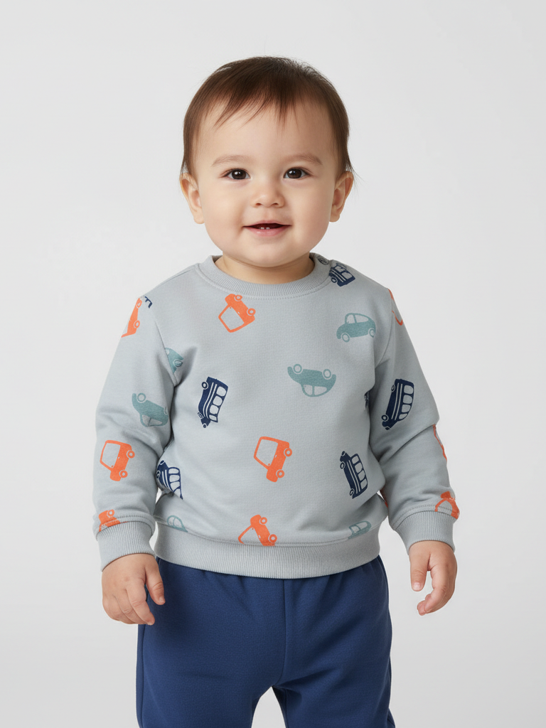 Детский свитшот для мальчиков из мягкого футера и оверсайз-кроем. Спущенная линия плеч и круглый воротник с манжетами и низом из ребристой ткани обеспечивают удобство при носке. Яркий принт с машинками добавляет весёлый акцент.