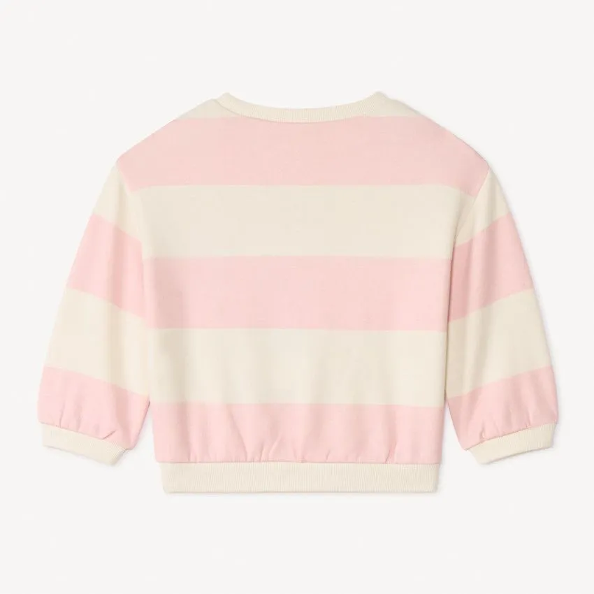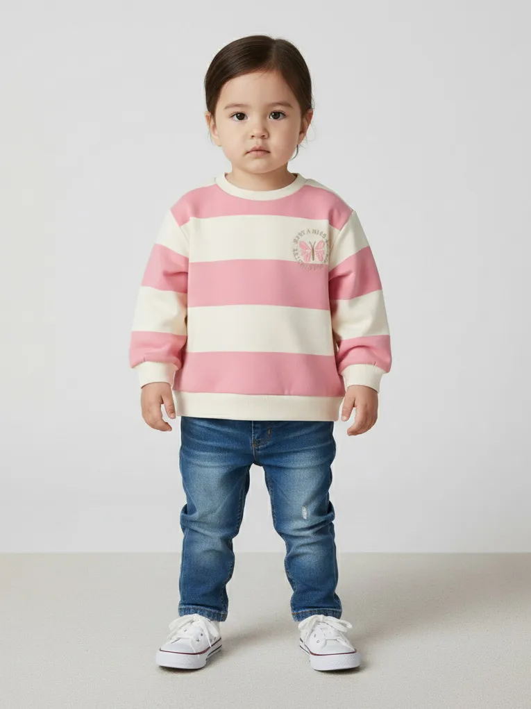 На груди расположено изображение бабочки, добавляющее свитшоту милый и нежный акцент. Модель отлично подойдёт для прогулок, детского сада и домашнего отдыха, сочетаясь с брюками, леггинсами или джинсами.