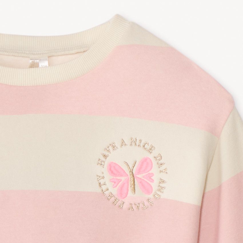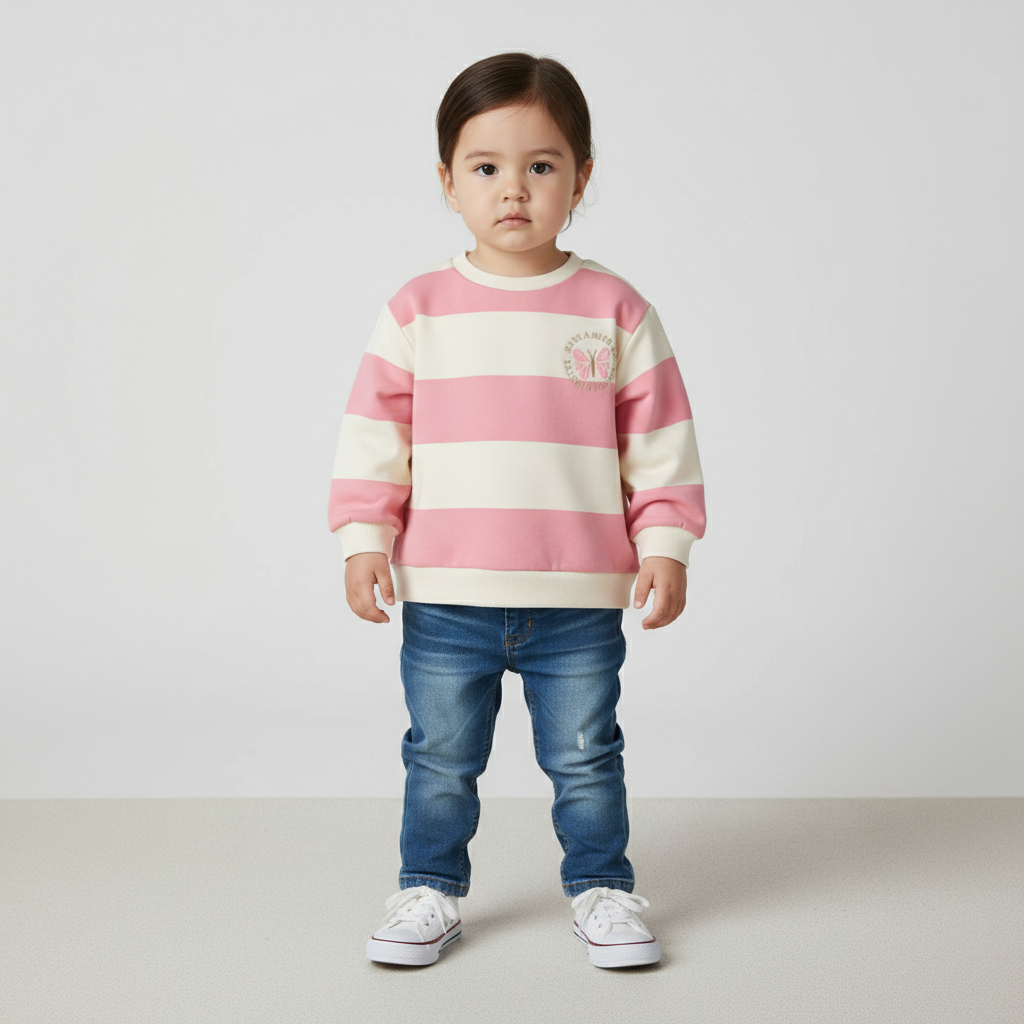 На груди расположено изображение бабочки, добавляющее свитшоту милый и нежный акцент. Модель отлично подойдёт для прогулок, детского сада и домашнего отдыха, сочетаясь с брюками, леггинсами или джинсами.