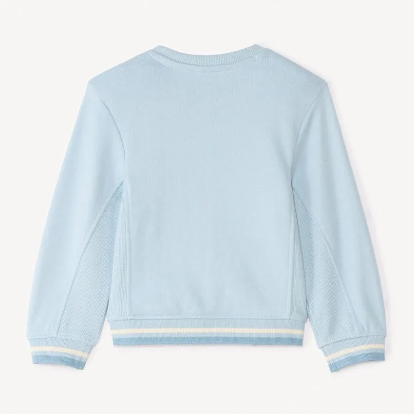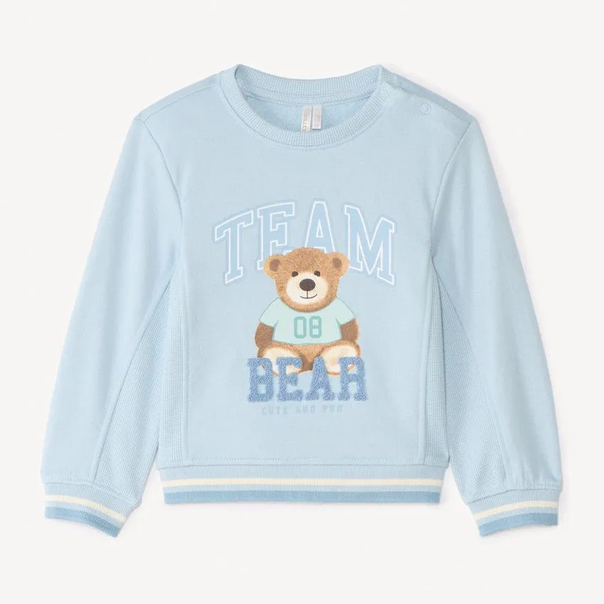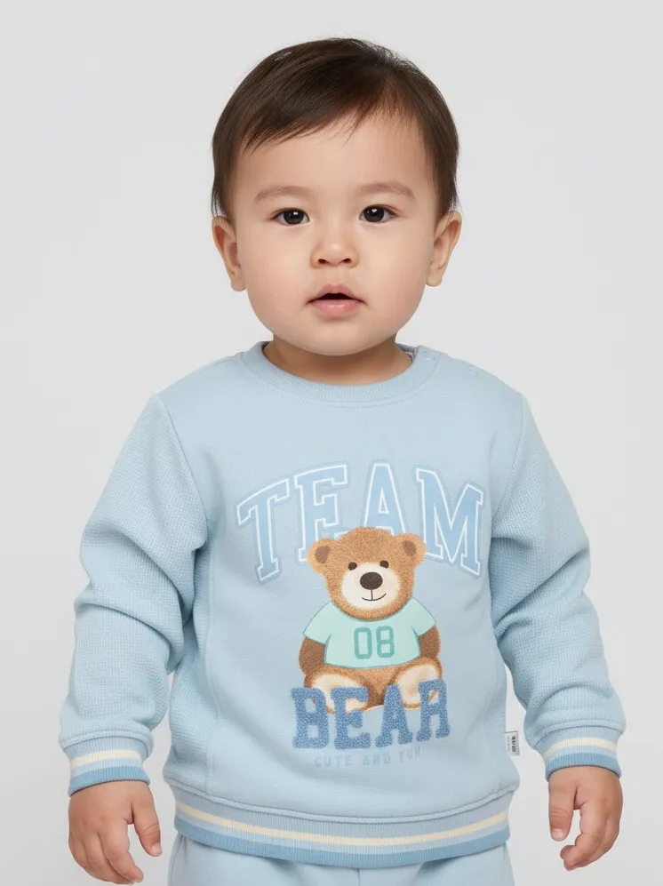 Модель дополнена эластичными ребристыми манжетами и нижним краем для удобной посадки. По центру расположен вышитый принт с мишкой и надписью, придающий свитшоту аккуратный и милый вид.